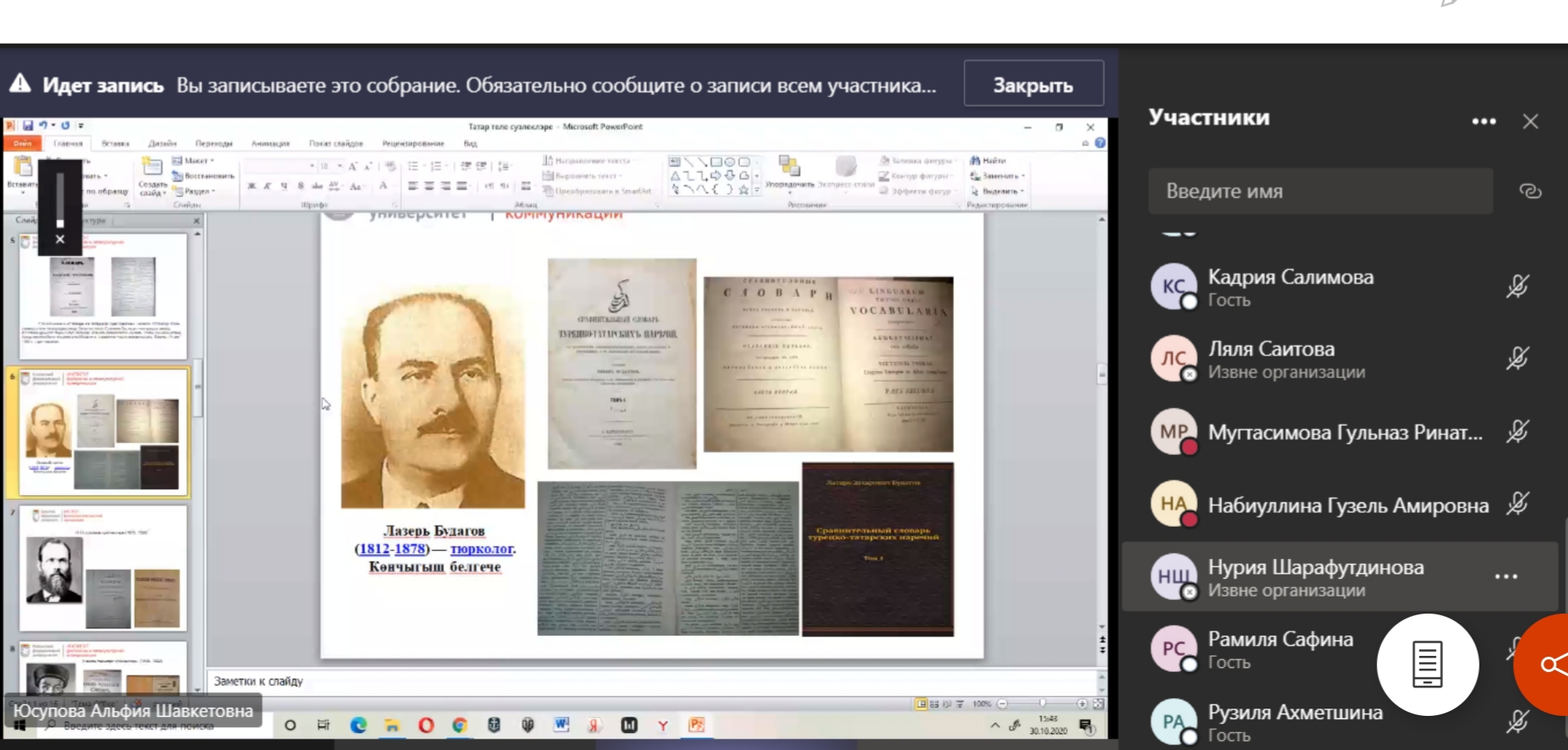30 октября состоялась онлайн лекция доктора филологических наук, профессора ИФМК КФУ, директора Института Каюма Насыри Альфии Шавкетовны Юсуповой на тему «Татарская лексикография XIX века». Она была организована на платформе Казанского Федерального университета в Microsoft Teams.