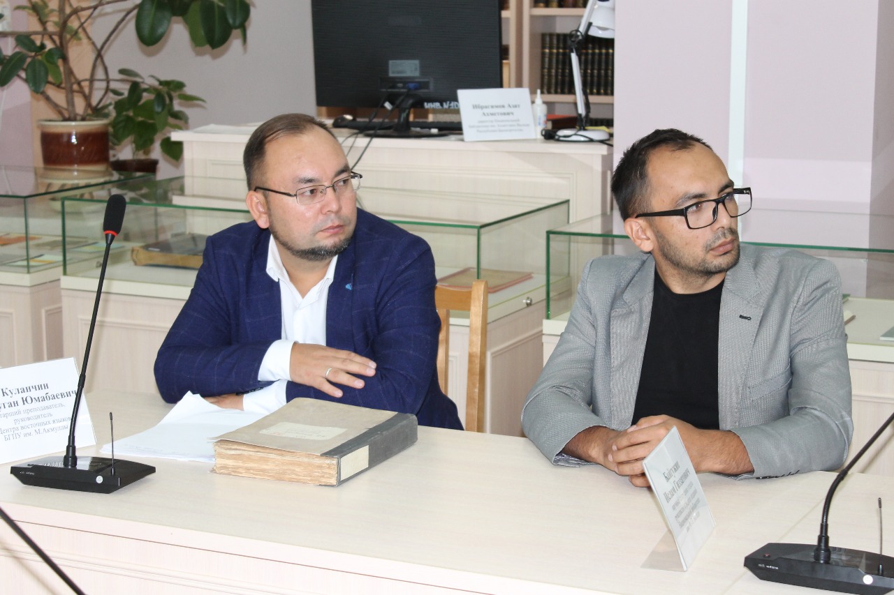 Руководитель Центра восточных языков БГПУ им. М. Акмуллы, к.ф.н. Куланчин А.Ю. принял участие в круглом столе «Роль Н.К. Дмитриева в становлении и развитии тюркской и башкирской филологической науки», посвященном 125-летию со дня рождения лингвиста-тюрколога, доктора филологических наук, профессора, член-корреспондента Академии наук СССР, заслуженного деятеля науки Башкирской АССР Николая Константиновича Дмитриева, который прошел в  Отделе рукописей и редких изданий Национальной библиотеки им. А.-З. Валиди.  Модераторами круглого стола выступили к.ф.н., доцент, заведующий отделом рукописей и редких изданий Ф. Ш. Сибагатов и д.ф.н., профессор Ю.В. Псянчин. В мероприятии с докладами выступили д.ф.н., член-корреспондента РАН А.В. Дыбо, д.ф.н., профессор, ведущий научный сотрудник Центра компаративистики РГГУ О.А. Мудрак,  к.ф.н., доцент, заведующий кафедрой тюркской филологии Восточного факультета СПбГУ Н.Н. Телицин, заведующая архивом УФИЦ РАН Л.М. Гиниятуллина, к.ф.н., заведующая библиотекой УФИЦ РАН Р.Ю. Сибагатова, переводчик кафедры тюркской филологии ИСАА МГУ К.А. Верхова. Айтуган Юмабаевич в своем выступлении отметил, что в Центре восточных языков Акмуллинского университета хранится уникальная рукопись Н.К. Дмитриева «Башкирская грамматика» 1945 г.