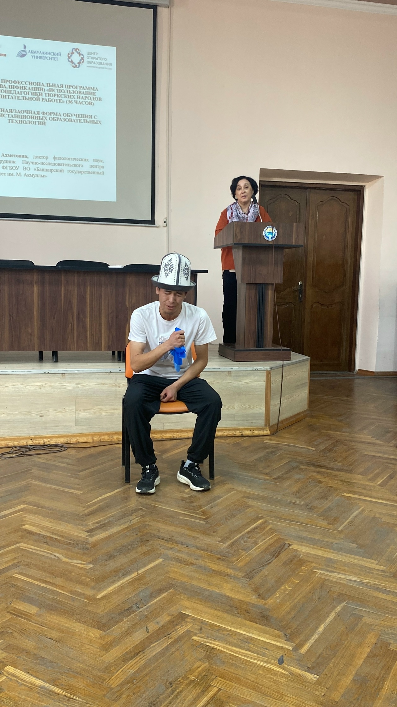 И.о. заведующего кафедрой тюркской и восточной филологии ФБФ Айтуган Юмабаевич Куланчин в эти дни работает со студентами  Кыргызского национального университета им. Жусупа Баишева. Он и наши коллеги из Научно-исследовательского центра башкирского фольклора БГПУ  д.филол.н. Н.А. Хуббутдинова и Р.А. Султангареева работают со студентами на курсах повышения квалификации по по тюркской литературе, этнопедагогике, тюркскому фольклору. Лекции и практические занятия были организованы для студентов 1 курса педагогического факультета и 3 курса факультета физической культуры. Всего в мероприятии приняли участие 53 человека.