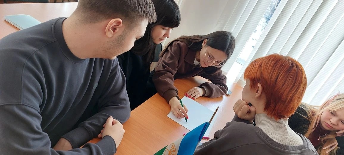 Закрепили информацию короткой блиц-викториной с простыми и веселыми вопросами. Кроме того, студенты с удовольствием выполнили  рисунок флага Башкортостана из трех цветов, подчеркнув тем самым свою связь с республикой.