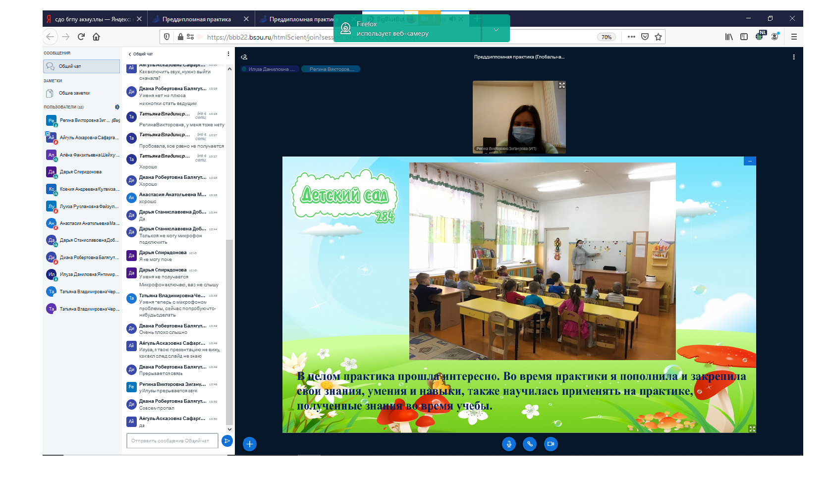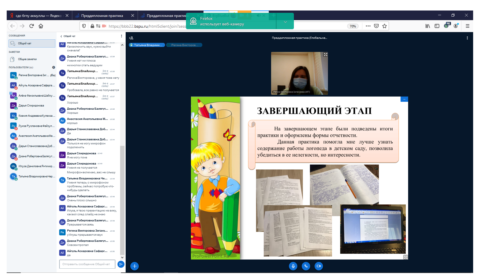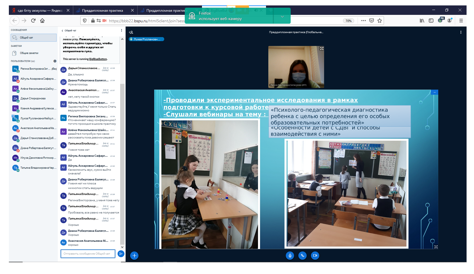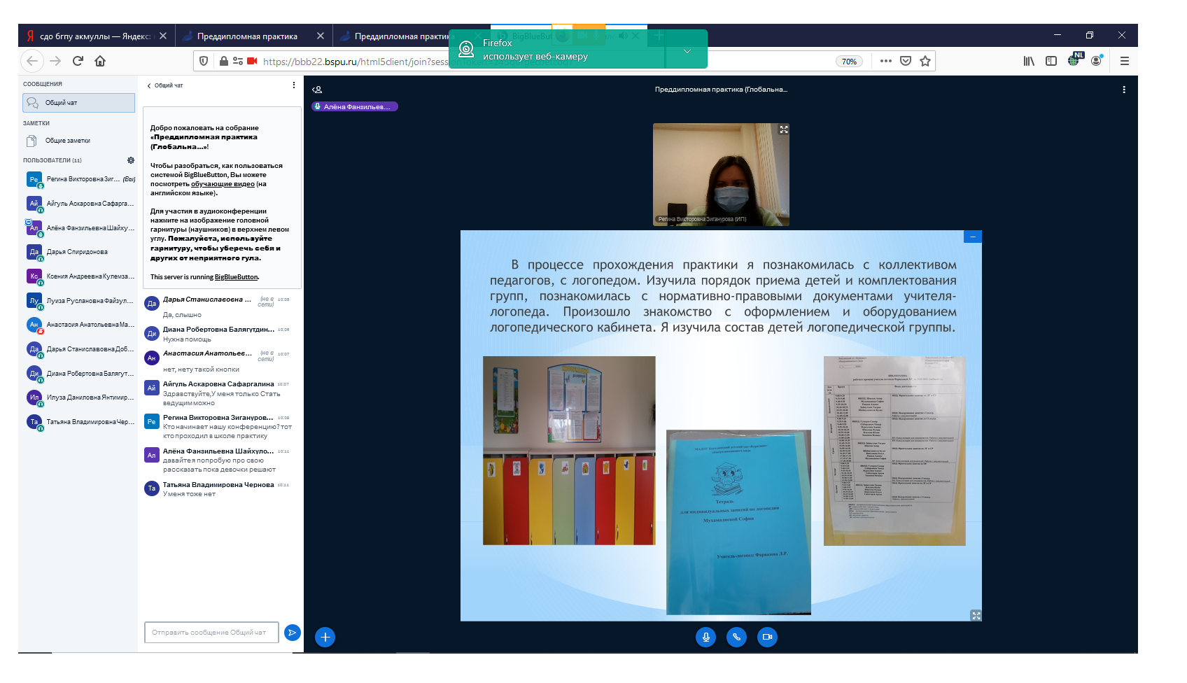 19 ноября 2020 года прошла отчетная конференция у студентов 4 курса  специального (дефектологического) образования профиля «Логопедия» на базе платформы «Система дистанционного обучения БГПУ им. М.Акмуллы».   С 17 октября по 14 ноября 2020 студенты гр. СОЛОГ-41-17 проходили преддипломную практику в образовательных организациях Республики Башкортостан (МАОУ Лицей № 42 г.Уфа, МАДОУ детский сад комбинированного вида №32 «Дуслык» г. Белебей, МБДОУ детский сад №9 «Малышка» комбинированного вида г. Давлеканово, МАДОУ Бакалинский детский сад «Буратино» общеразвивающего вида, МАДОУ детский сад №284 г. Уфа) под руководством старшего преподавателя Зигануровой Р.В.