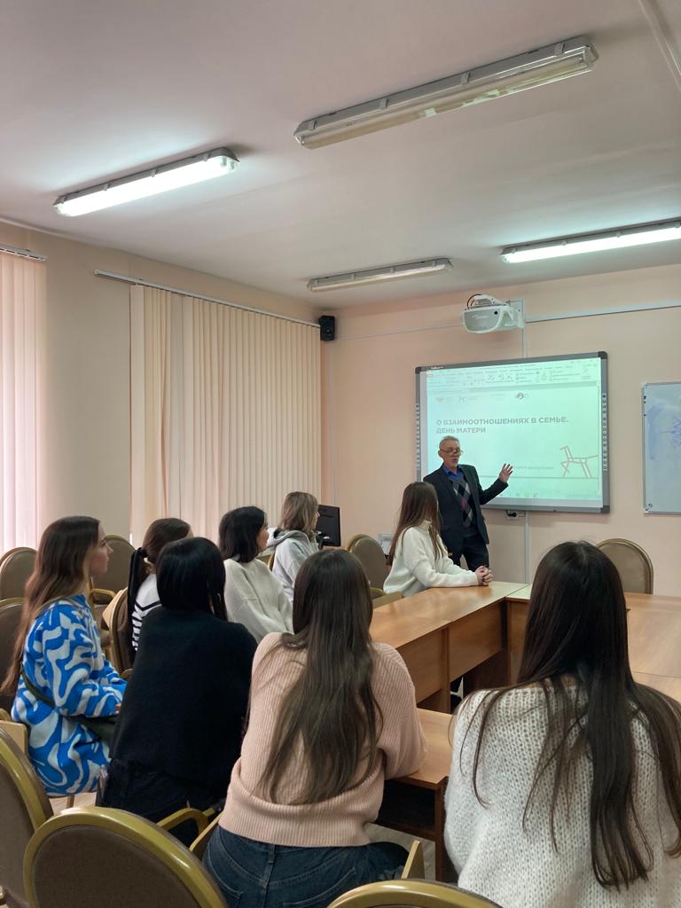 20 ноября 2023 года со студентами групп СОЛОГ-11-23 и СОДД-11-23 в рамках проведения Разговора о важном состоялся кураторский час, посвященный особенностям взаимоотношений в семье. Куратор Сайтханов А.Ф. обсудил со студентами вопросы, связанные с образом матери, дома, а также взаимоотношений в семьи. Также со студентами 1 курса прошло активное обсуждение вопросов, связанных с государственной поддержкой материнства и детства.