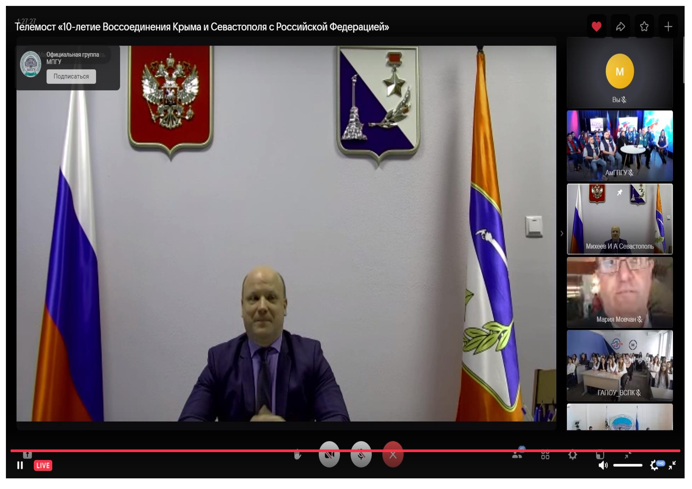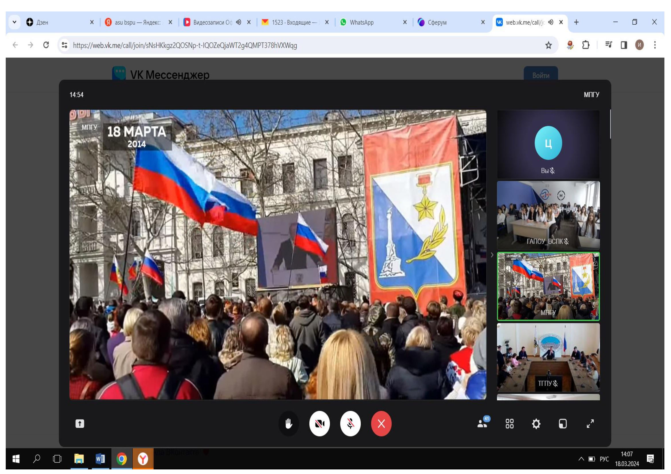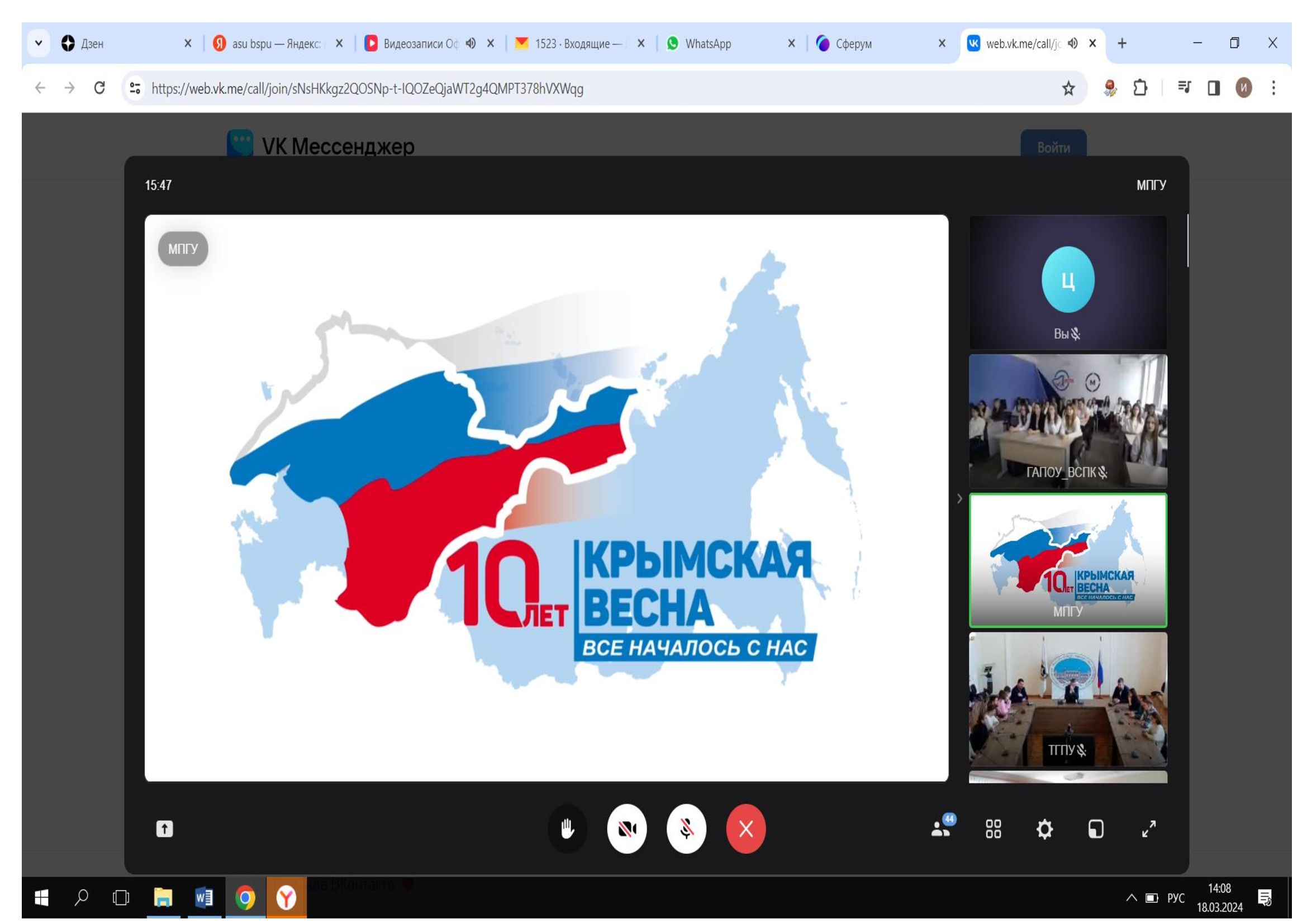 18 марта 2024 года исполняется 10 лет историческому событию –вхождению Крыма в состав России. Ровно 10 лет назад в Крыму прошел референдум, по результатам которого полуостров вошел в состав Российской Федерации. В 2014 году больше 96% крымчан проголосовали за воссоединение с Россией. В результате референдума полуостров Крым официально вошел в состав Российской Федерации, а Республика Крым и Город-герой Севастополь получили статус субъектов Российской Федерации. Студенты, магистранты и преподаватели кафедры специальной педагогики и психологии в формате телемоста присоединились к празднованию десятилетия воссоединения Крыма и Севастополя с Российской Федерацией. В ходе телемоста участники вспомнили хронику событий Крымской весны 2014 года, порадовались изменениям, произошедшим на полуострове после его присоединения к РФ.