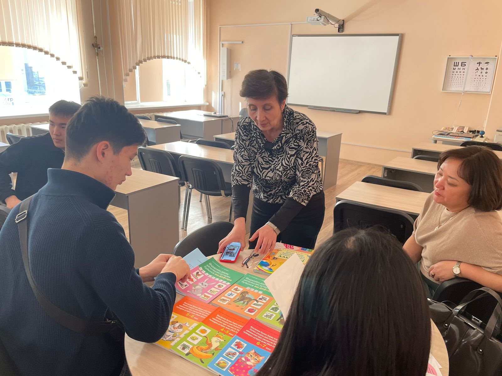 Канд.пед.наук, доцент кафедры СПиП Касимова Э.Г. рассказала о направлениях подготовки кафедры, условиях поступления, правилах приема и особенностях сдачи вступительных испытаний по направлению подготовки «Специальное (дефектологическое) образование», рассказала о научной деятельности кафедры специальной педагогики и психологии, презентовала учебно-методические, учебные пособия, разработанные и опубликованные преподавателями кафедры в рамках научных исследований, продемонстрировала ЦРК «Мастерская специальных технологий инклюзивного образования», оборудование, необходимое для подготовки будущих специалистов в области специального (дефектологического) образования, а также ответили на вопросы участников встречи.