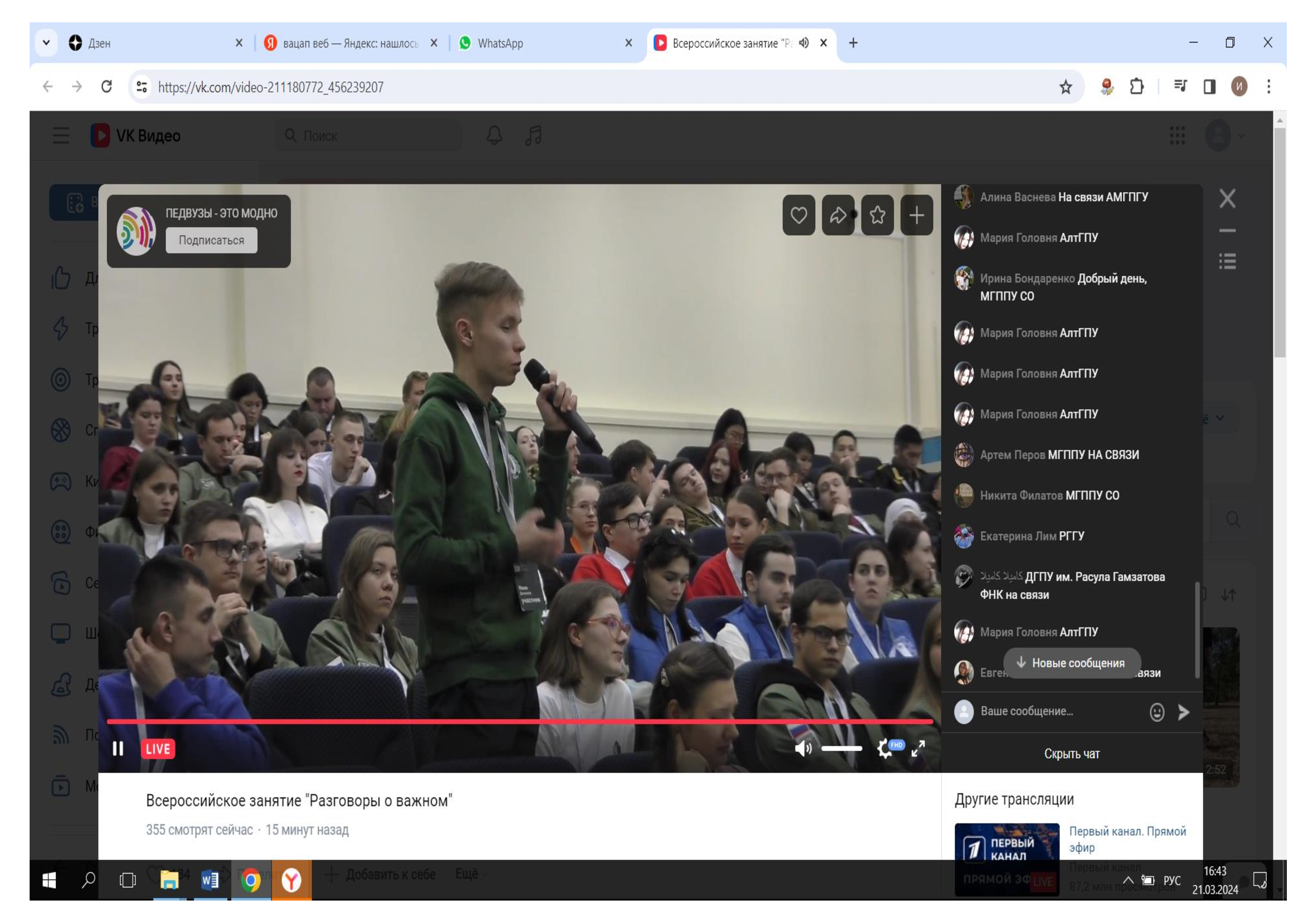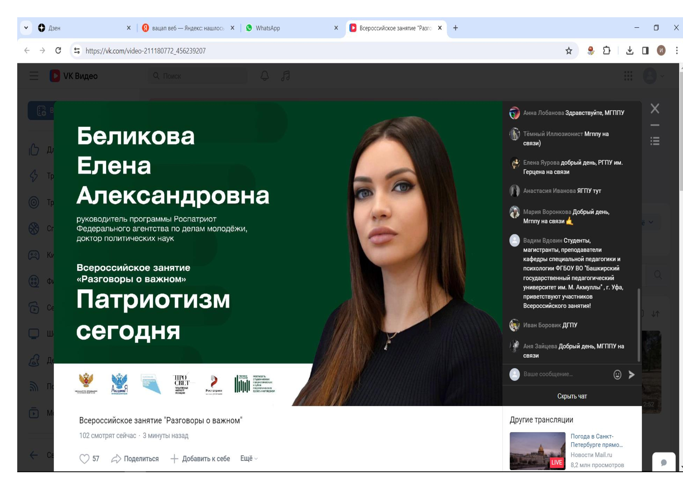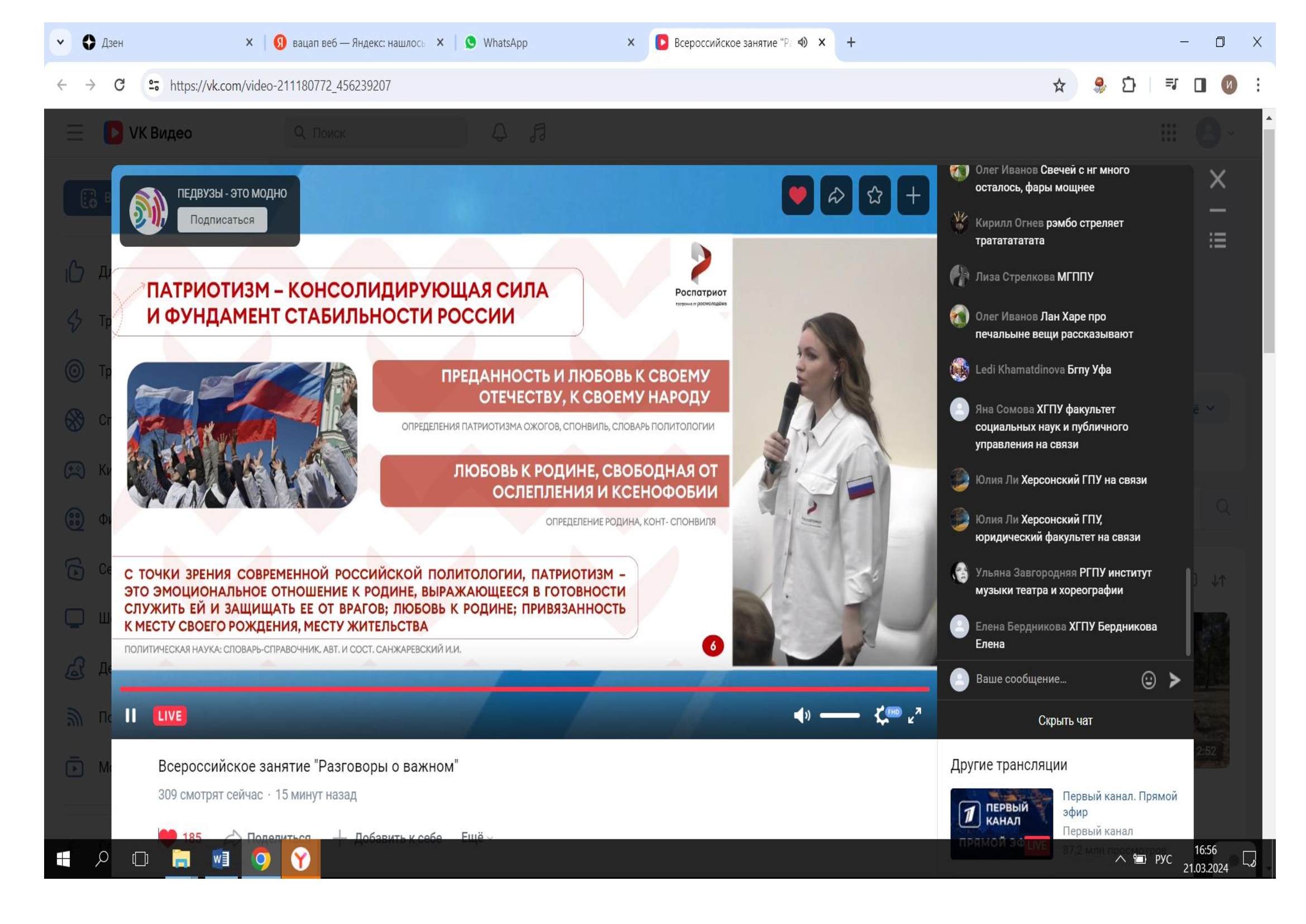 В рамках фестиваля студенческих патриотических клубов педагогических вузов и колледжей федерального проекта «Патриотическое воспитание граждан Российской Федерации» национального проекта «Образование» при поддержке Министерства просвещения Российской Федерации 21 марта 2024 года состоялось Всероссийское занятие «Разговоры о важном» на тему «Патриотизм сегодня», которое провела Елена Беликова, руководитель программы Роспатриот Федерального агентства по делам молодежи, доктор политических наук.
