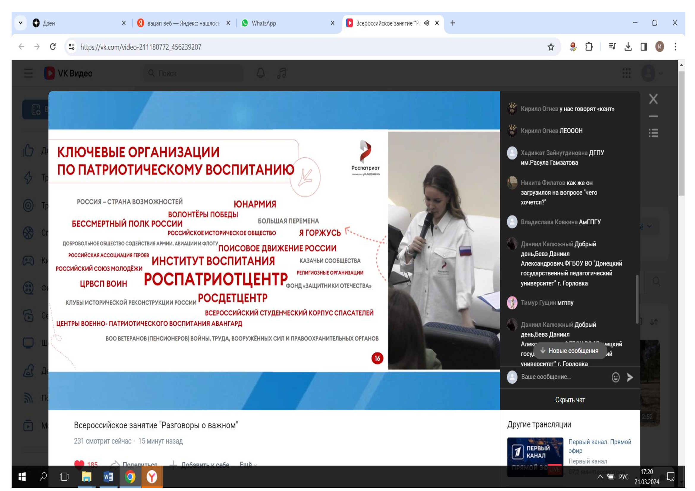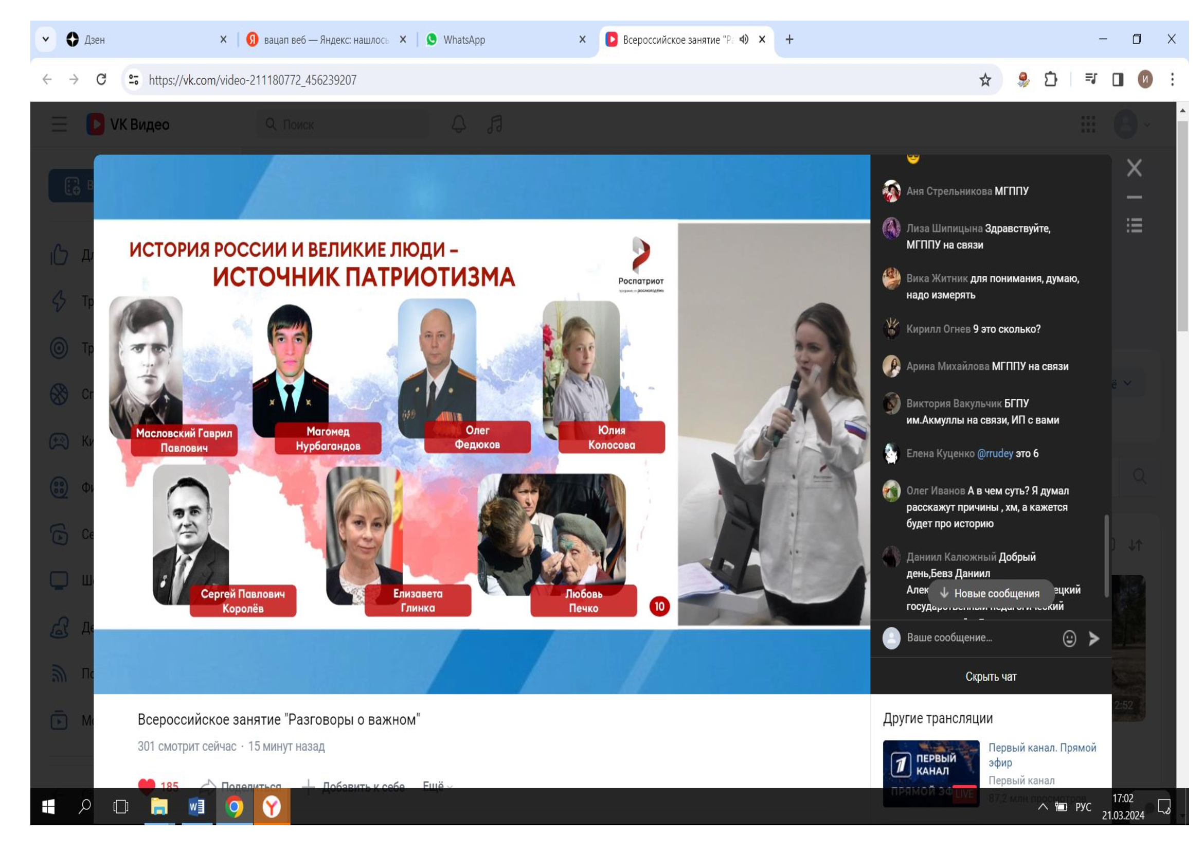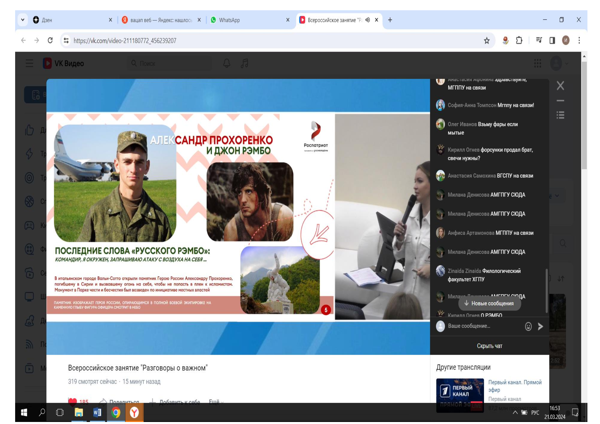 В рамках фестиваля студенческих патриотических клубов педагогических вузов и колледжей федерального проекта «Патриотическое воспитание граждан Российской Федерации» национального проекта «Образование» при поддержке Министерства просвещения Российской Федерации 21 марта 2024 года состоялось Всероссийское занятие «Разговоры о важном» на тему «Патриотизм сегодня», которое провела Елена Беликова, руководитель программы Роспатриот Федерального агентства по делам молодежи, доктор политических наук.
