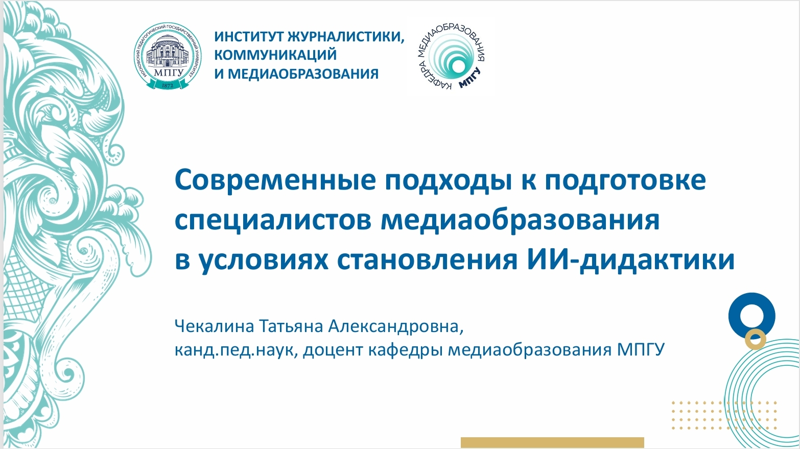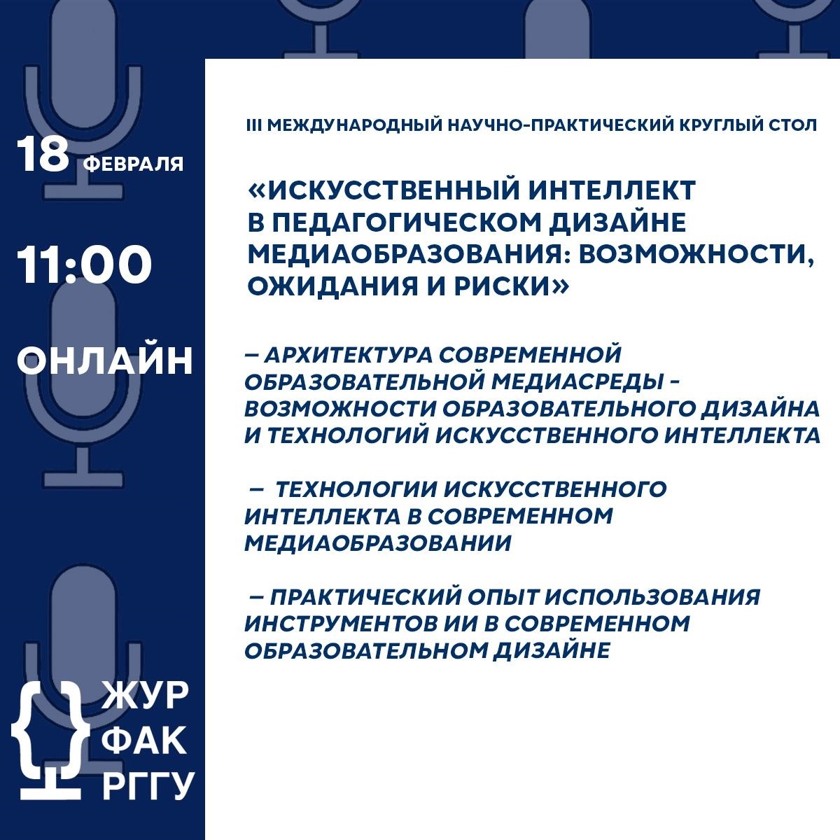 18 февраля состоялся III Международный научно-практический круглый стол «Искусственный интеллект в педагогическом дизайне медиаобразования: возможности, ожидания и риски», организованный кафедрой продюсирования и медиатехнологий ФГАОУ ВО «Российский государственный гуманитарный университет». Зав.кафедрой специальной педагогики и психологии Цилюгина И.Б. приняла участие в работе круглого стола.