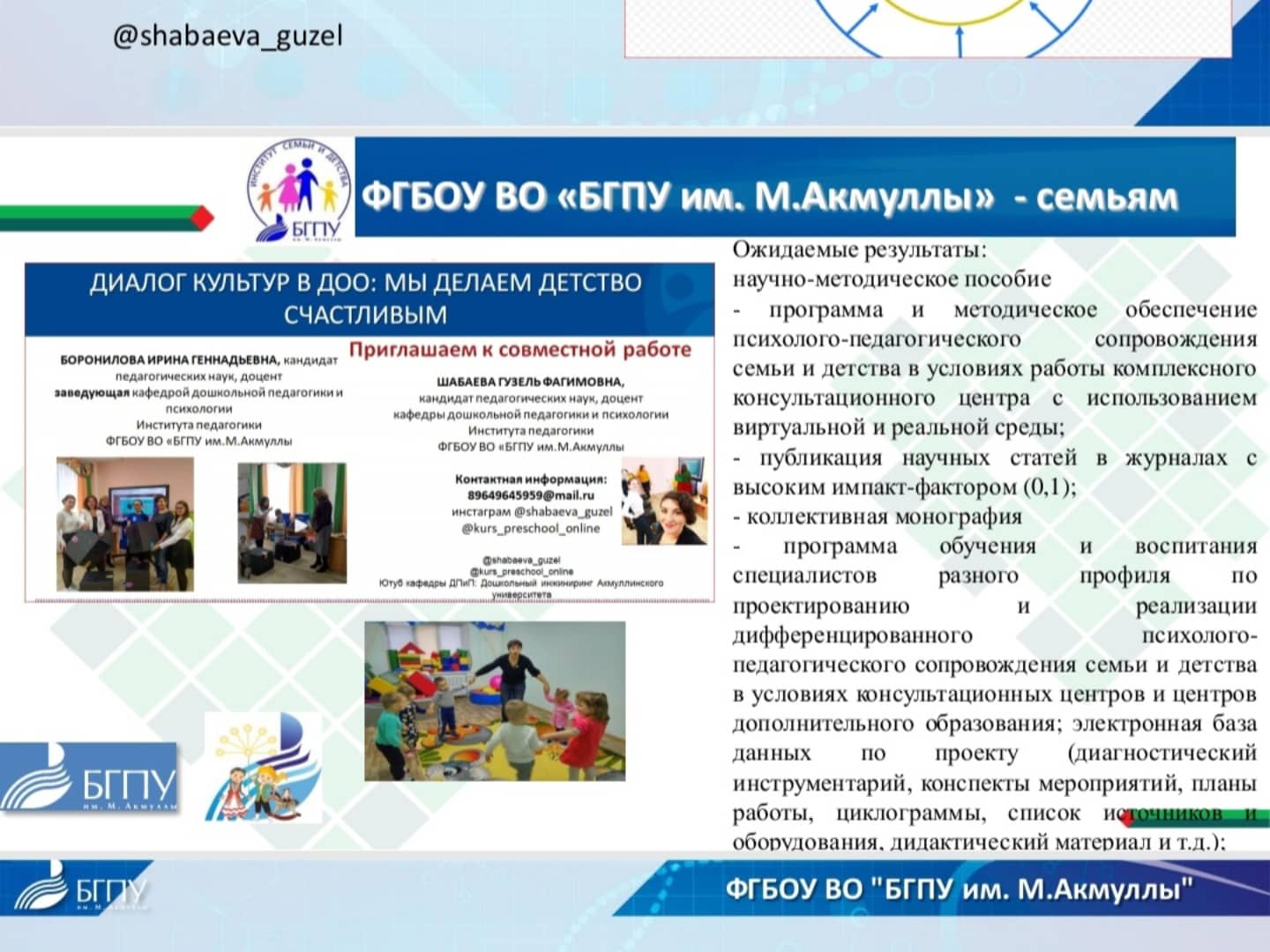 В соответствии с планом научно-исследовательской деятельности Духовная образовательная организация высшего образования "РОССИЙСКИЙ ИСЛАМСКИЙ УНИВЕРСИТЕТ" Центрального духовного управления  мусульман России "БГПУ им.М.Акмуллы" Шабаева Гузель Фагимовна, к.п. н., доц. ИП "БГПУ им.М.Акмуллы"  в роли спикера-эксперта приняла участие в научно-методическом семинаре "Научно-методический основы изучения и преподавания исламской теологии, истории и культуры в духовных образовательных организациях" с презентацией опыта работы со студентами, магистрантами  в мастерских World skills и центров развития компетенций (#КотоффKids" кафедры ДПиП)  на тему: " Исторический аспект изучения темы" " Уважение и почитание родителей" - как основной духовно-нравственной задачи воспитательной работы в ДОО".
