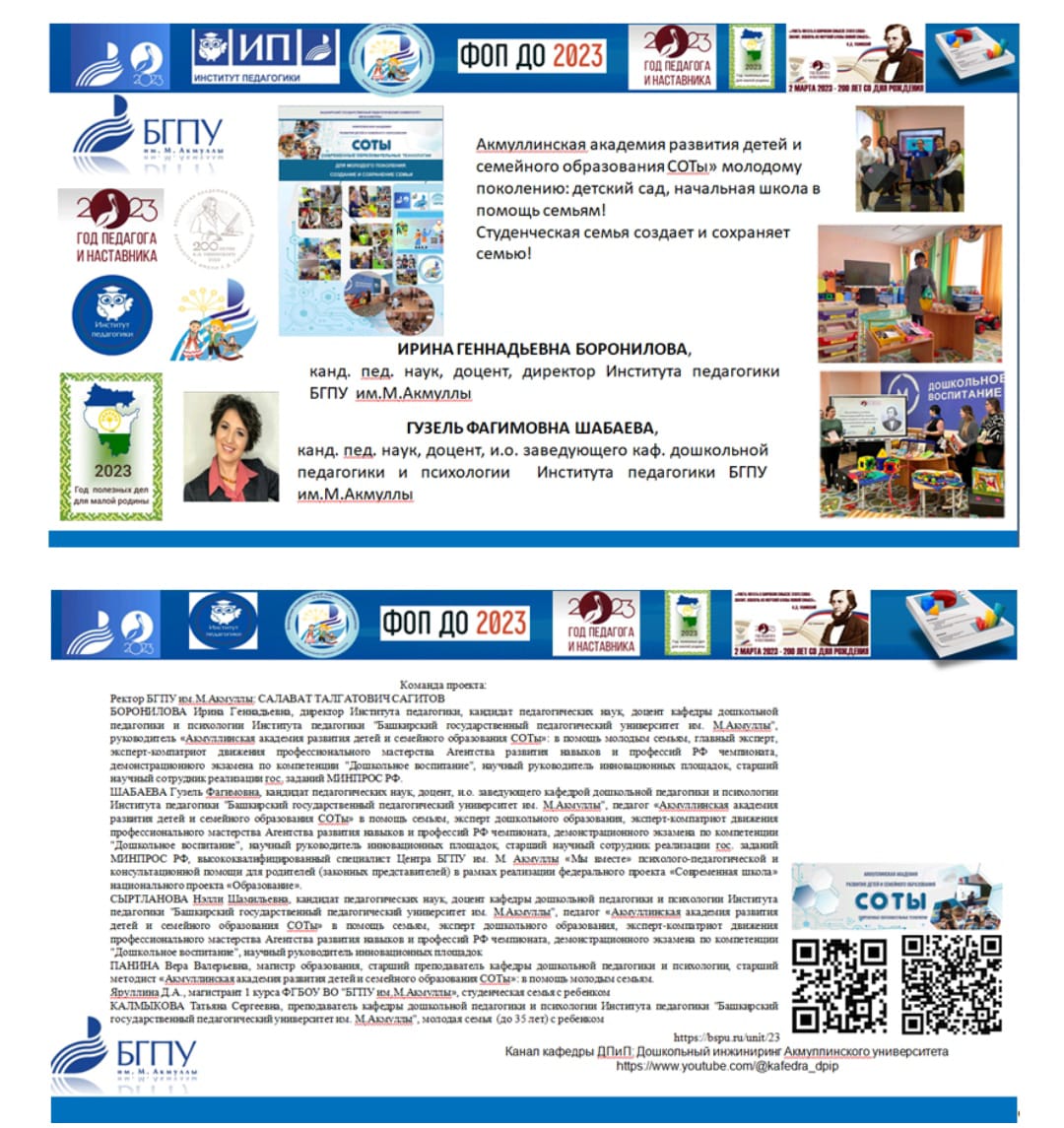 Боронилова Ирина Геннадьевна: кандидат педагогических наук, доцент директор Института педагоги, руководитель Центра развития компетенций «Акмуллинской академии развития детей и семейного образования СОТЫ» БГПУ им.М.Акмуллы, главный эксперт, компатриот участников движения профессионального мастерства Агентства развития навыков и профессий РФ по компетенции «Дошкольное воспитание»;