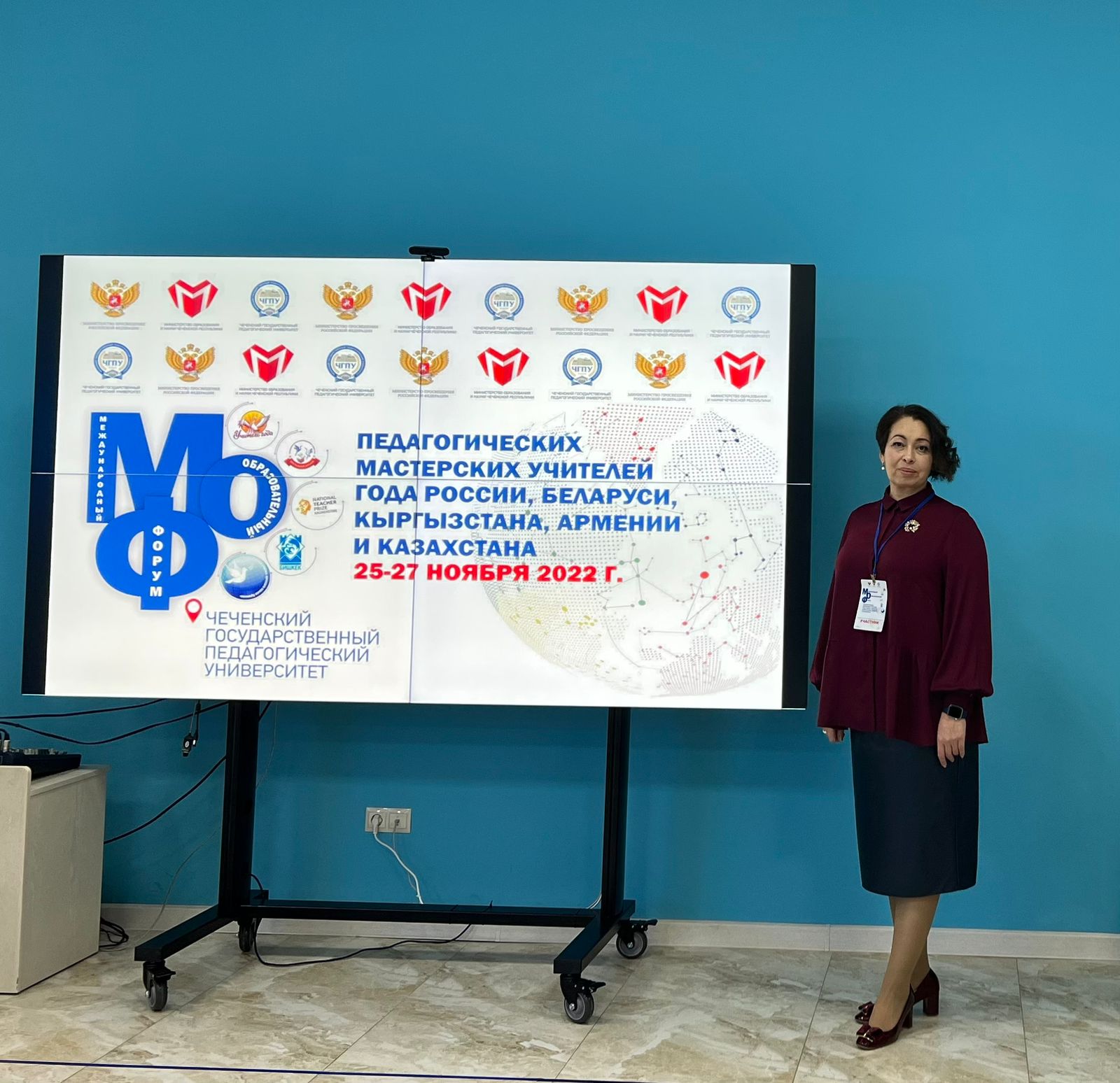 25-27 ноября 2022 в г.Грозный в Чеченском Государственном Педагогическом Университете прошел III Международный Образовательный Форум Педагогических мастерских Учителей Года России, Беларуси, Кыргыстана, Армении и Казахстана. В работе форума приняла участие Сафиуллина Эмма Эдуардовна, заместитель директора по УВР ИЯ МАОУ «Гимназия 39 им. А.Ш.Файзуллина», которая совмещает должность консультанта Акмуллинского Университета РБ и является автором-куратором нескольких образовательных проектов для студентов педагогического университета.