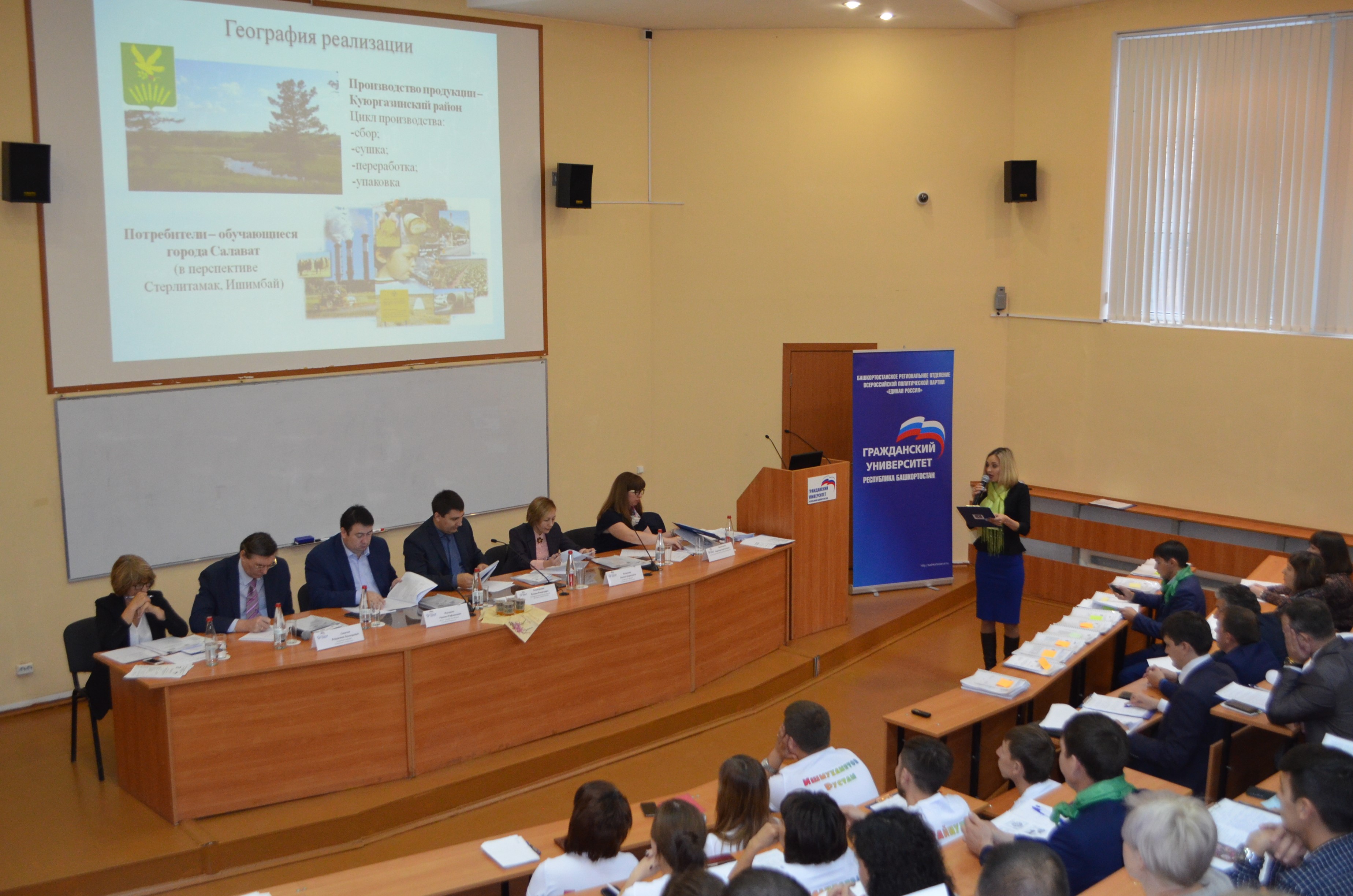 Состоялась защита проектов выпускников Высшей школы управления проекта «Гражданский университет» ВПП «ЕДИНАЯ РОССИЯ». Обучение проводилось по дополнительной образовательной программе профессиональной переподготовки «Государственное и муниципальное управление в Республике Башкортостан».   К итоговой аттестации допущены 76 человек. В период обучения слушателями разработаны 15 проектов, которые рекомендованы к внедрению в Республике Башкортостан. Тематика представленных проектов раскрывала проблемы экологической, социальной и политической направленности.