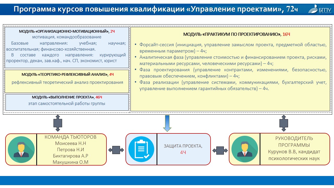 В соответствии с Федеральным законом «Об образовании в Российской Федерации» №273 ФЗ от 29.12.2012 г., Приказом Минздравсоцразвития РФ от 11.01.2011 г. №1н «Об утверждении единого квалификационного справочника должностей руководителей, специалистов и служащих, раздел «Квалификационные характеристики должностей руководителей и специалистов высшего профессионального и дополнительного профессионального образования», требованиями федеральных государственных образовательных стандартов, внедрением профессиональных стандартов в деятельность Университета,  с целью повышения квалификации руководителей структурных подразделений Университета в рамках корпоративного обучения на 2018-2019 учебный год была утверждена программа курсов повышения квалификации: "Управление проектами" в объеме 72 часов. Руководитель программы кандидат психологический наук, доцент Курунов В.В; Спикеры программы: Моисеева Н.Н., Биктагирова А.Р., Макушкина О.М.