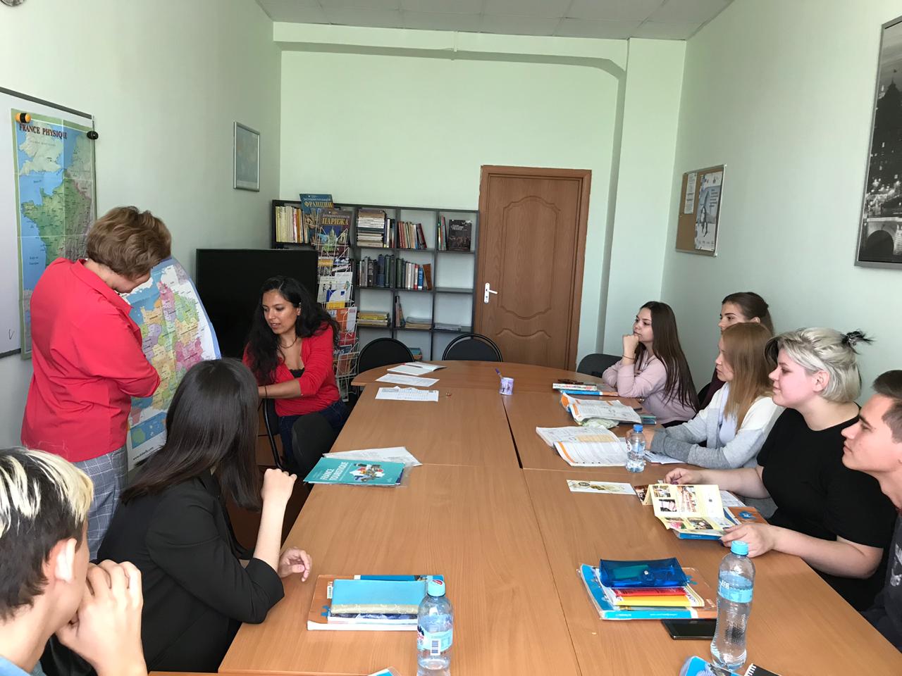 Со студентами 2 курса Селина провела квиз о Франции, в ходе которого они узнали много нового из истории страны и об образе жизни современных французов. Будущих переводчиков - медиаторов межкультурной коммуникации интересовало также восприятие Селиной наших реалий, поэтому они спрашивали её отношение к нашим обычаям, нашей кухне и природе. Общение получилось душевным, позитивным. В ответ Анна Денисова прочитала стихотворение С.Есенина, вся группа спела песню на русском языке под аккомпанемент гитары.