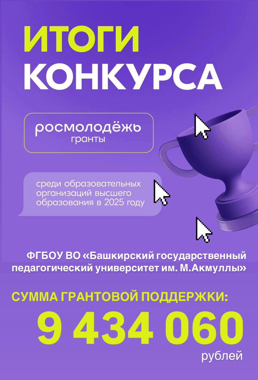Комплексная программа развития молодежной политики Акмуллинского университета «Лидеры перемен», поданная на конкурс «Росмолодёжь.Гранты» среди образовательных организаций высшего образования в 2025 году, получила поддержку и финансирование в размере 9,4 млн руб.