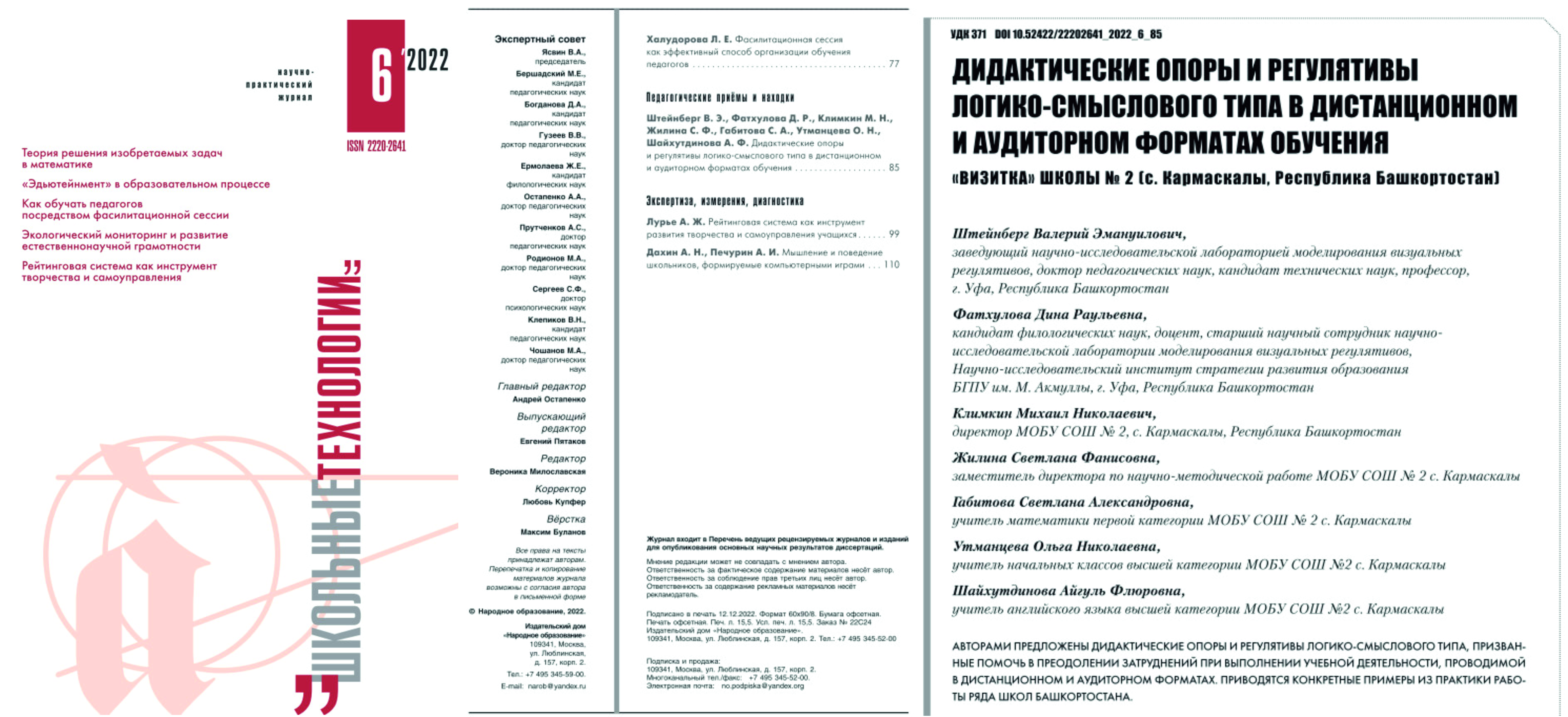 В рамках выполнения Государственного задания Министерства просвещения №073-03-2021-015/2 «Проектирование программно-методического сопровождения инноваций в сельской школе» вышла в свет статья «Дидактические опоры и регулятивы логико-смыслового типа в дистанционном и аудиторном форматах обучения», подготовленная главным научным сотрудником НИИ, заведующим научной лабораторией моделирования визуальных регулятивов логико-смыслового типа профессором В.Э. Штейнбергом и старшим научным сотрудником НИИ Д.Р. Фатхуловой совместно с сельскими учителями СОШ № 2 с. Кармаскалы М.Н. Климкиным, С.Ф. Жилиной, С.А.Габитовой, О.Н.Утманцевой и А.Ф. Шайхутдиновой. Публикация в № 6 научного издания «Школьные технологии» ( журнал перечня ВАК) была подготовлена в результате инновационного проекта «Инновационная технология визуальных дидактических регулятивов как основа развития когнитивных способностей школьника».