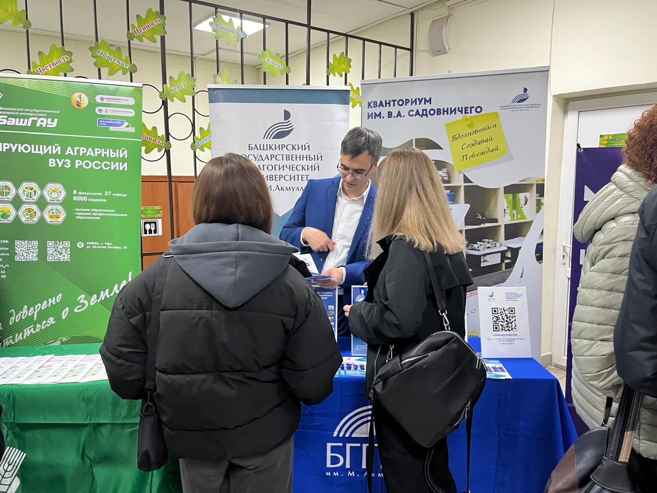 В фойе школы  расположились выставочные стенды высших учебных заведений Республики Башкортостан, где школьники и родители общались с представителями вузов, могли проконсультироваться и получить раздаточные материалы.