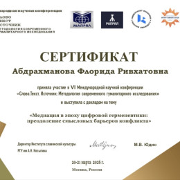 ​Руководитель студенческого объединения «Философский клуб «Генезис»», Абдрахманова Флорида Ривхатовна выступила с докладом на тему «Медиация в эпоху цифровой герменевтики: преодоление смысловых барьеров конфликта».