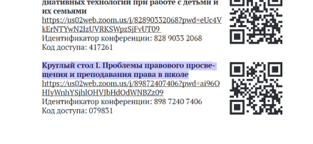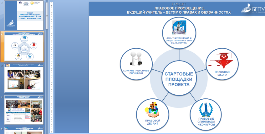 Шамигулова О.А., кандидат педагогических наук, доцент, директор Института исторического, правового и социально-гуманитарного образования выступила с докладом на круглом столе «Проблемы  правового  просвещения  и  преподавания  права  в  школе». Она представила многолетний опыт реализации в школах г. Уфы и республики Башкортостан  волонтерского проекта «Правовое просвещение: будущий учитель детям о правах и обязанностях», который ежегодно стартует в рамках Всемирного дня правовой помощи детям совместно с Уполномоченным по правам ребенка в РБ.