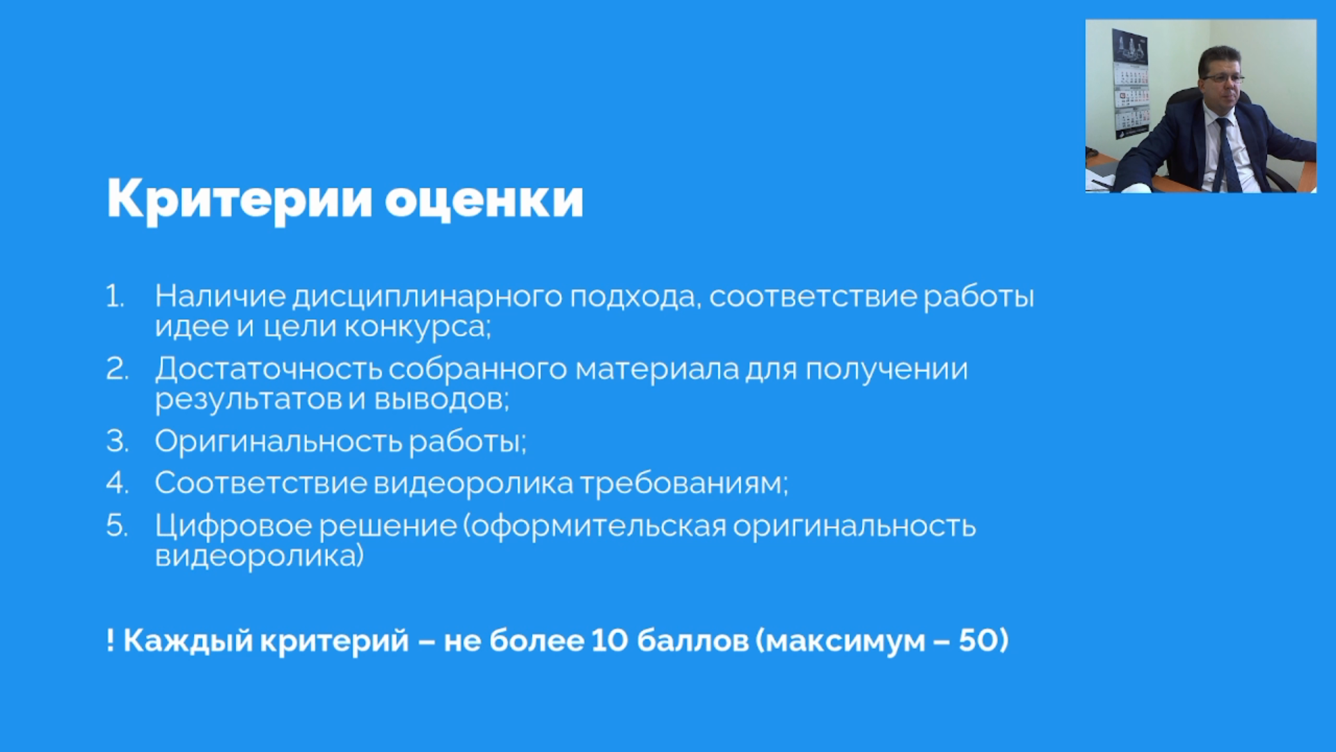 В прямом эфире были освещены основные положения конкурса, правила участия, регистрации и приёма заявок. Спикеры остановились на этапах подготовки исследовательского проекта, написании сценария для видеоролика и монтажа готового продукта.