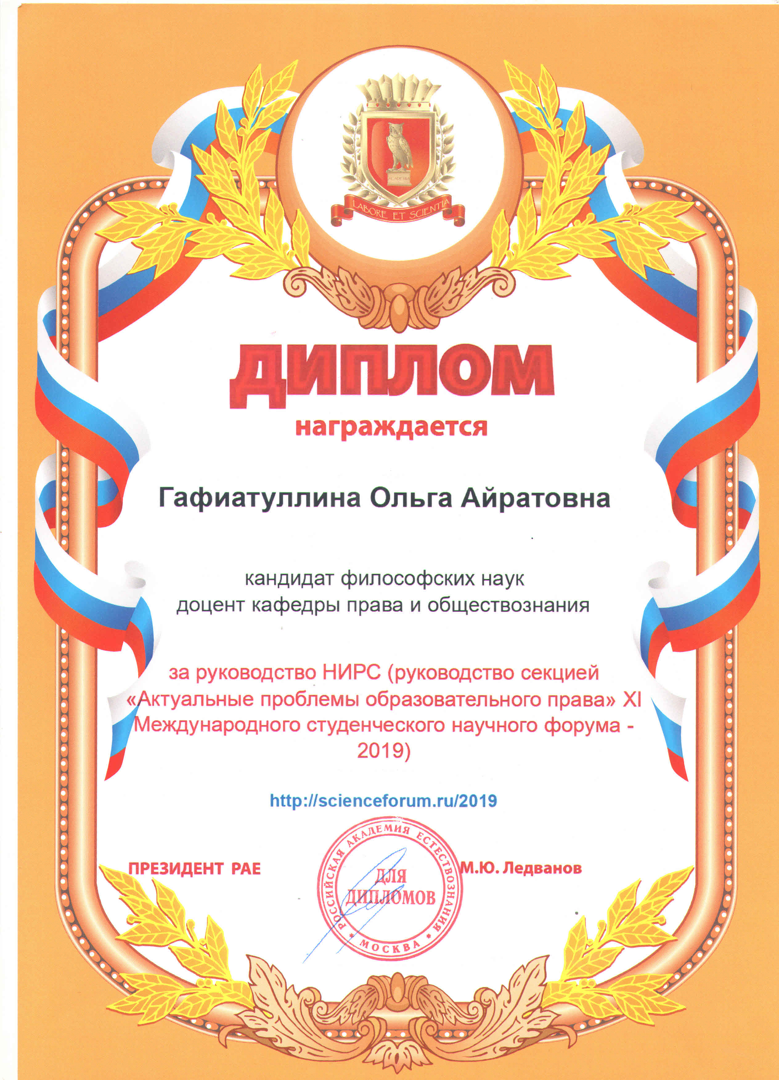 Поздравляем к.ф.н., доцента кафедры права и обществознания Гафиатуллину Ольгу Айратовну председателя секции «Актуальные проблемы образовательного права» XI Международного научного форума с получением диплома и свидетельства за руководство НИРС – самой активной секции. Сертификаты получили 35 участников секции. Победители секции – 6 человек получили дипломы за лучшую студенческую работу:
