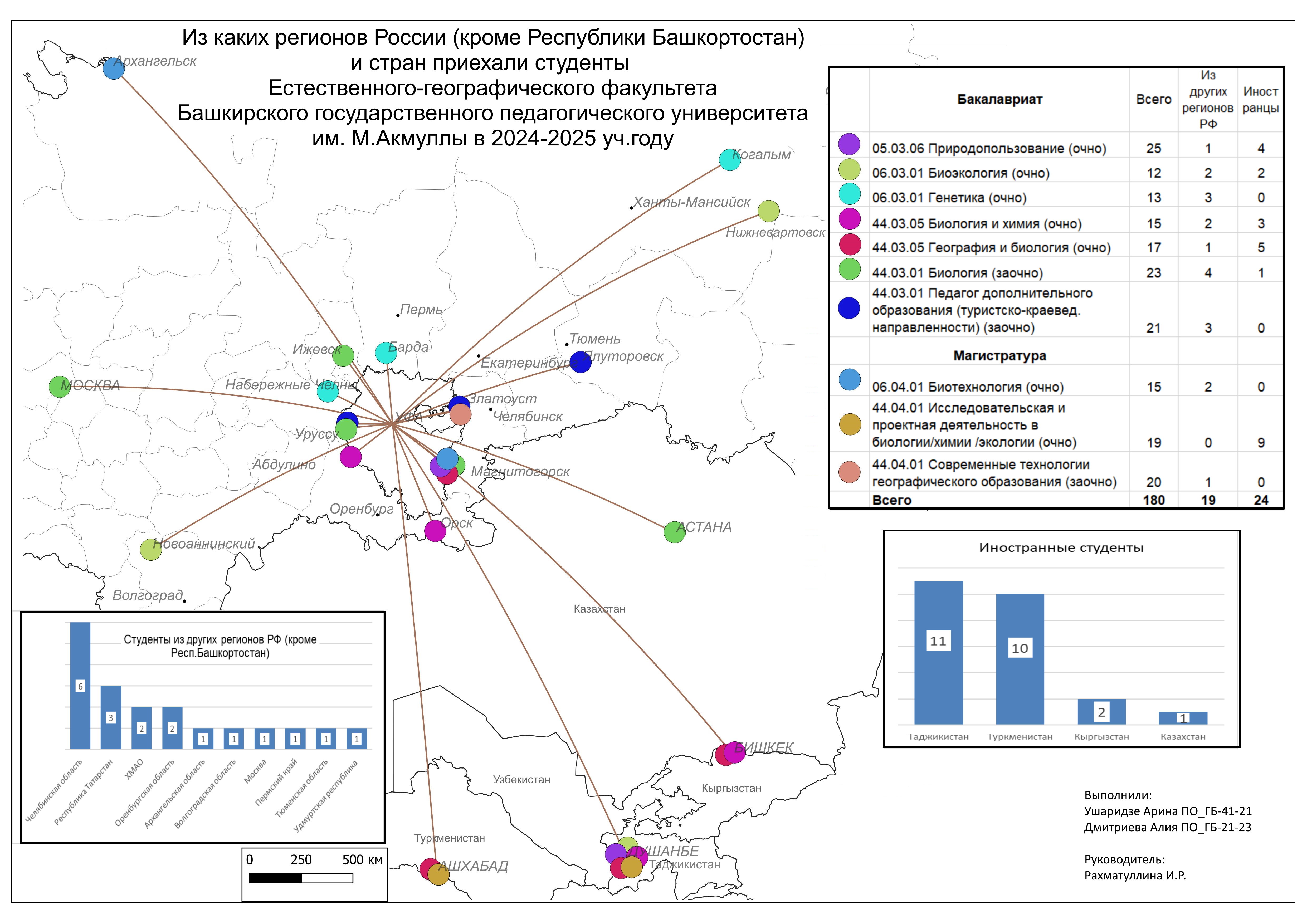 В рамках развития научно-образовательной школы «Цифровая картография и пространственный анализ» (рук. доцент кафедры экологии, географии и природопользования И.Р. Рахматуллина), студенты успешно завершили проекты по созданию карт. На основе предоставленных обезличенных данных деканатом Естественно-географического факультета студенты проанализировали и показали, из каких регионов приехали абитуриенты в этом году. По географии зарубежных стран и регионов России картографировали Ушаридзе Арина (ПО_ГБ-41-21) и Дмитриева Алия (ПО_ГБ-21-23), в разрезе районов Республики Башкортостан - Рашитова Азалия (ЭиП 31-22) и Халитова Элина (ЭиП 31-22). Работы выполнялись в свободно распространяемой программе QGIS.