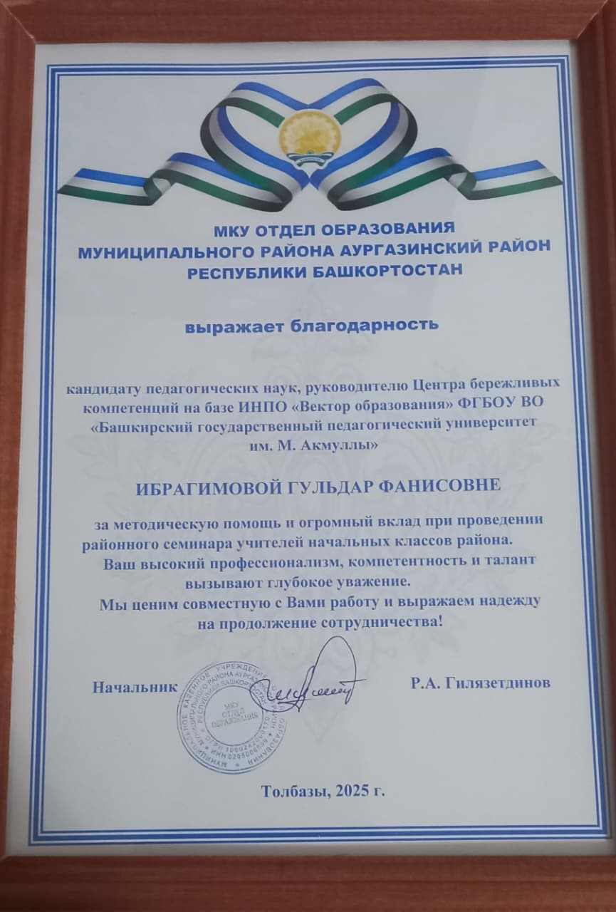 21 августа 2025г. Ибрагимова Гульдар Фанисовна (к.п.н., руководитель Центра бережливых компетенций на базе ИНПО «Вектор развития» ФГБОУ ВО «Башкирский государственный педагогический университет им. М. Акмуллы») приняла участие в августовском педагогическом совещании в муниципальном районе Аургазинский район Республики Башкортостан в качестве спикера со следующими темами доклада: «Формирование бережливой личности младшего школьника в контексте изменений ФГОС НОО» и «Ключевые аспекты реализации проекта «Комфортная школа» с использованием бережливых технологий».