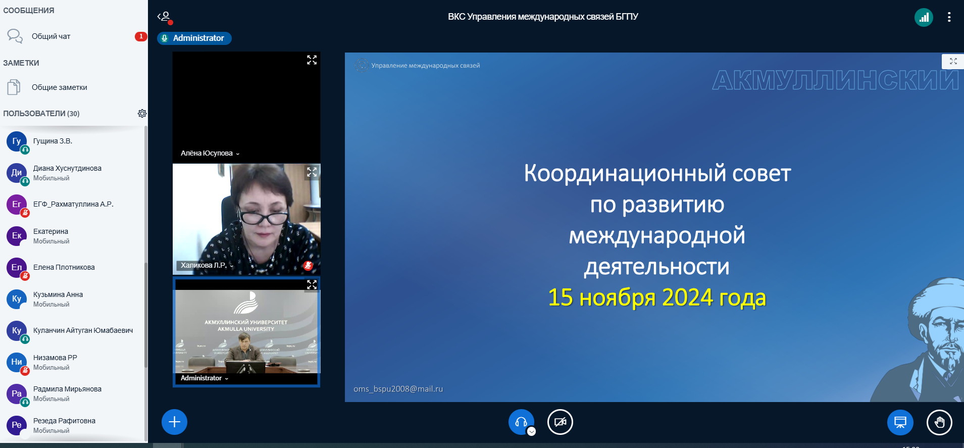 Повестка заседания была посвящена утверждению нового состава Координационного совета, участию обучающихся БГПУ им. М.Акмуллы в проекте «Российский учитель за рубежом», а также регистрации иностранных обучающихся выпускных курсов в программе квоты Правительства РФ, которая продлится до 15 января 2025 года.
