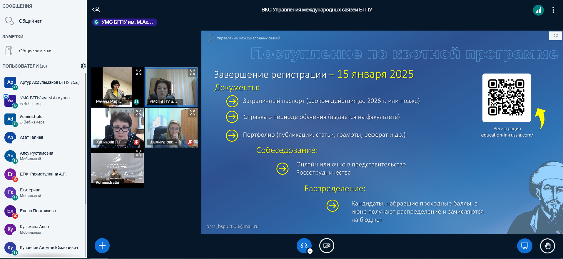 В своем выступлении начальник УМС рассказала о работе, проделанной в рамках регистрации кандидатов из числа выпускников БГПУ им. М.Акмуллы на квоту Правительства РФ, деталях регистрации на сайте и реализации двудипломной магистратуры в рамках УШОС совместно с вузами-партнерами.