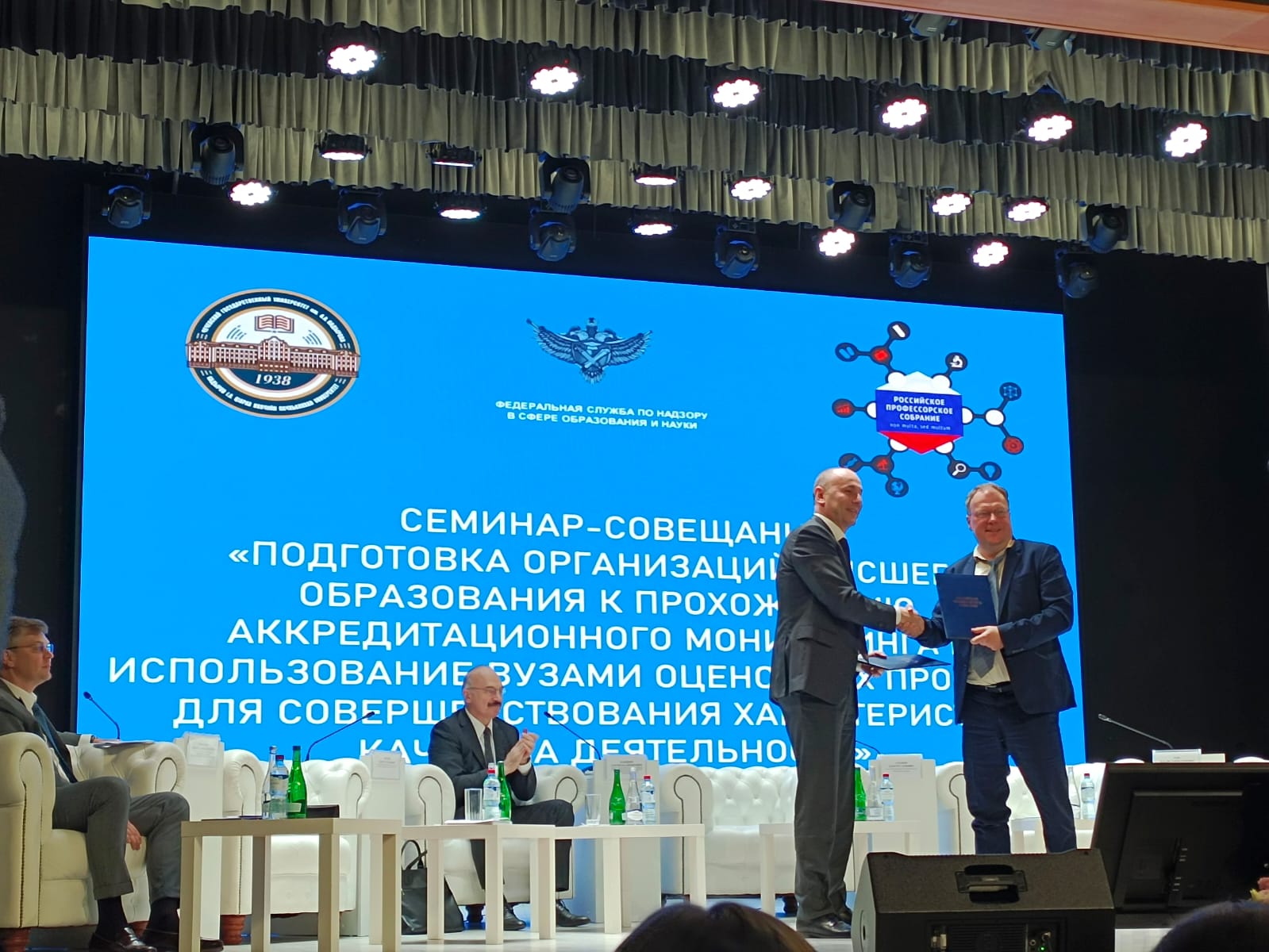 Также в рамках семинара прошло торжественное подписание соглашения о сотрудничестве между Федеральной службой по надзору в сфере образования и науки и Общероссийской общественной организацией «Российское профессорское собрание», направленное на усиление содействия в подготовке вузов к прохождению аккредитационного мониторинга и компетентному проведению профессионально-общественной аккредитации и независимой оценки качества подготовки обучающихся.