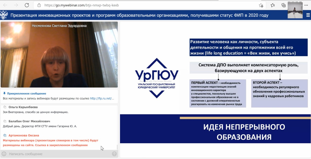 В вебинаре приняли участие директор ИНПО «Вектор развития» Гузель Калимуллина и руководитель научно-методического центра сопровождения педагогических работников Оксана Гумерова. На вебинары обсуждались вопросы деятельности федеральных инновационных площадок, функционирующих на базе организаций высшего образования РФ.