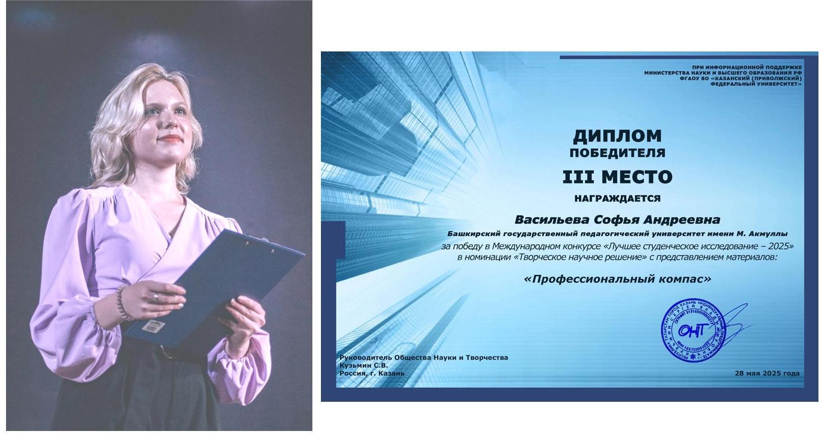 • Софья Васильева – III  место в номинации «Творческое научное решение» за работу «Профессиональный компас».