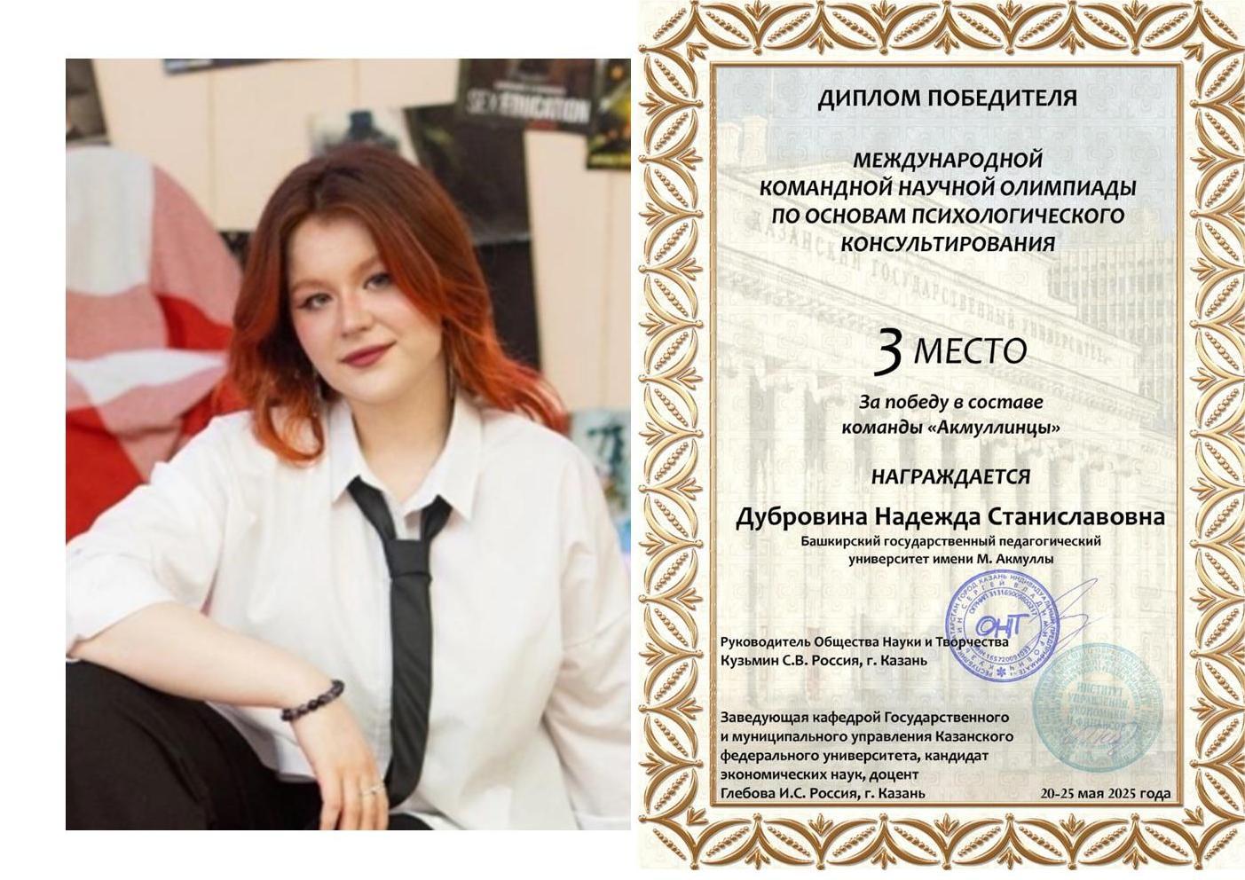 Факультет психологии поздравляет студентов с достижениями и выражает огромную благодарность научному руководителю Шаяхметовой Эльвире Шигабетдиновне, доктору биологических наук, профессору кафедры возрастной и социальной психологии, заведующему лабораторией психофизиологии и нейропсихологических исследований.