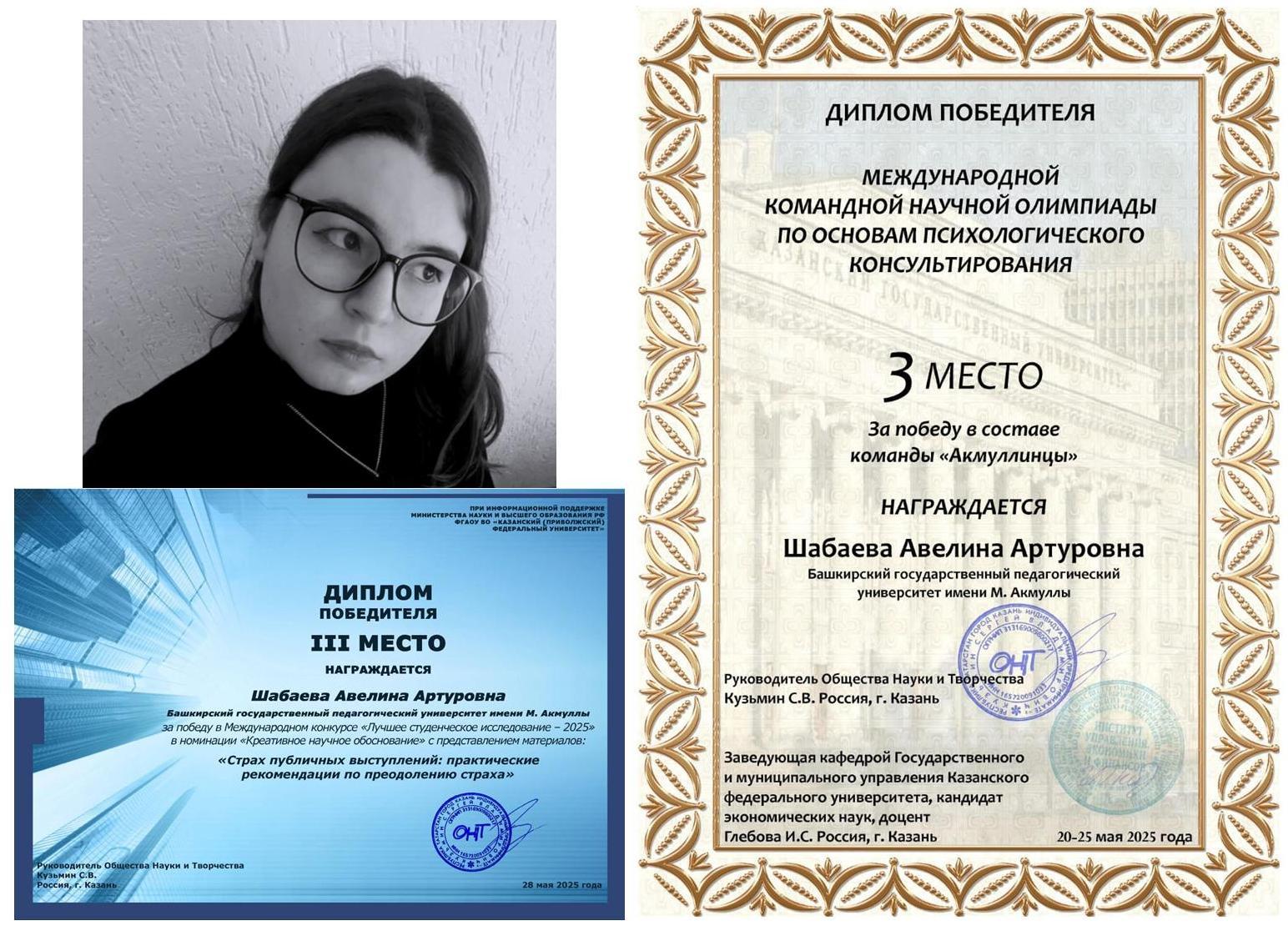 • Авелина Шабаева – III место в номинации «Креативное научное обоснование» за работу «Страх публичных выступлений: практические рекомендации по преодолению страха»;