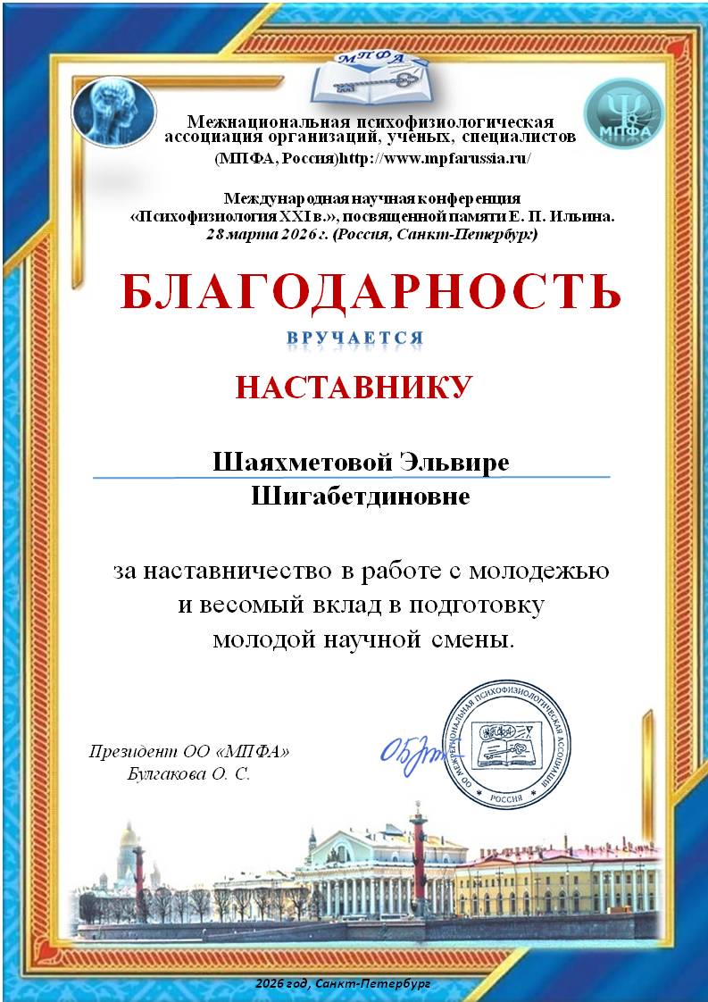 Шаяхметовой Эльвире Шигабетдиновне была выражена за благодарность за помощь в организации ФОРУМА и  за подготовку молодых психофизиологов.