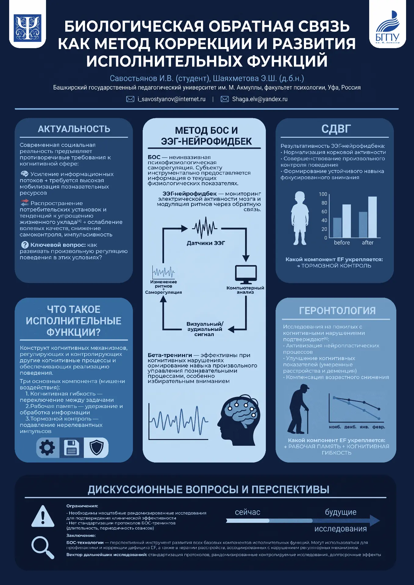 Иван представил исследование на тему «Биологическая обратная связь как метод коррекции и развития исполнительных функций», выполненное под научным руководством профессора кафедры возрастной и социальной психологии Эльвиры Шигабетдиновны Шаяхметовой. Работа была принята к участию в формате стендового доклада.