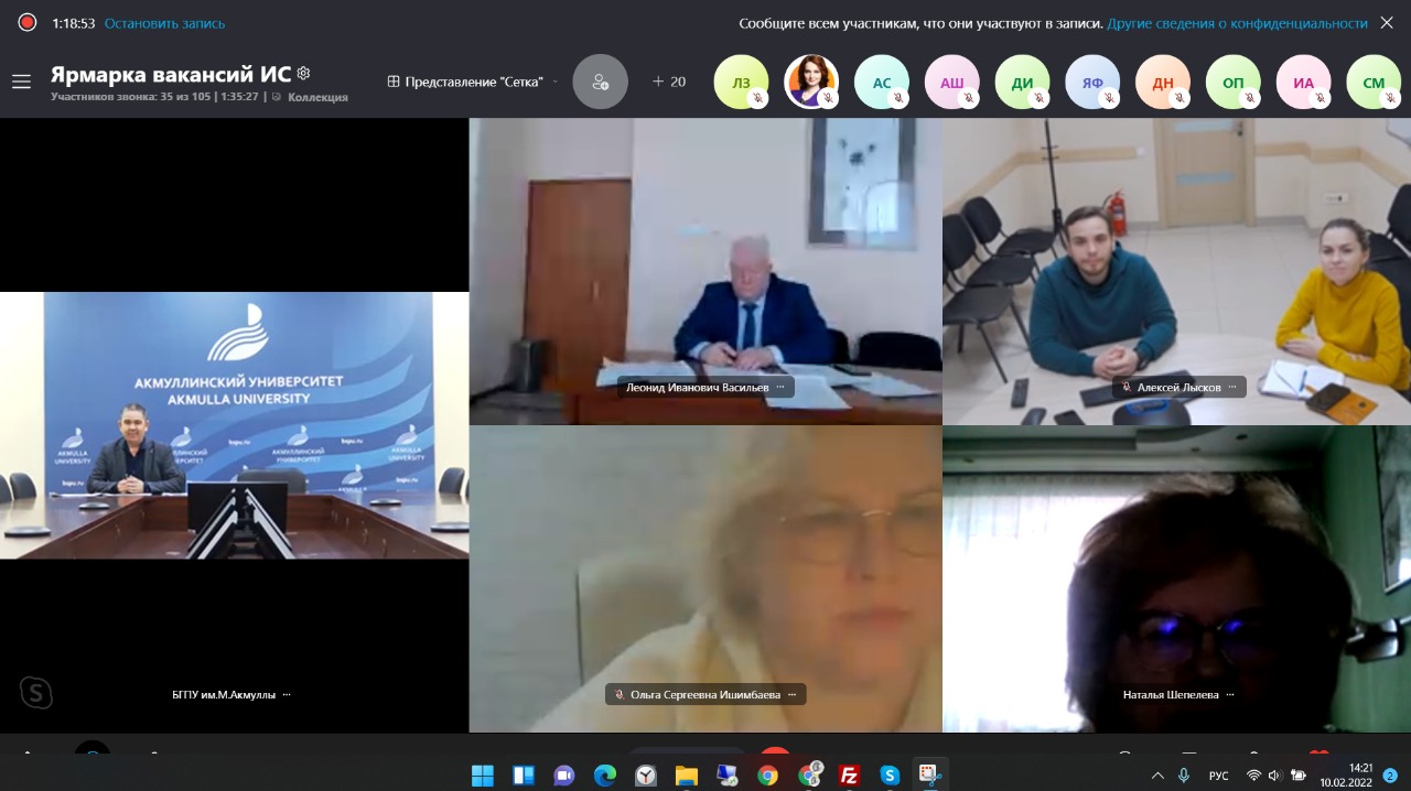 10.02.2022 г. в формате ВКС Уфимский государственный колледж технологии и дизайна организовал «Ярмарку вакансий» для студентов выпускных групп специальностей Информационные системы (по отраслям) и Информационные системы и программирования. Главный специалист отдела профессиональной ориентации ГКУ Центр занятости населения г. Уфы обрисовала ситуацию на рынке труда РБ и востребованность выпускников ИТ-специальностей. В мероприятии приняли участие представители 14 организаций, среди АО «Форт диалог», ГУП Центр ИКТ РБ, ООО «СберМедИИ», АО «Уфанет», ПАО «Ростелеком», ООО «МЕТТА», АНО «Школа 21» г. Москва и другие. Представители организаций  рассказали о своих предприятиях и обозначили требования к персоналу. В числе приглашенных докладчиков были и представители БГПУ им.М.Акмуллы: директор профориентационного центра Тимерханов Фидонис Фанавиевич рассказал о нашем Университете в целом, правилах приема 2022 года, а доцент кафедры Информационных технологий Старцева Оксана Геннадиевна - о деятельности кафедры и технических направлениях подготовки (Информационные системы и технологии, Прикладная информатика), которые она реализует.
