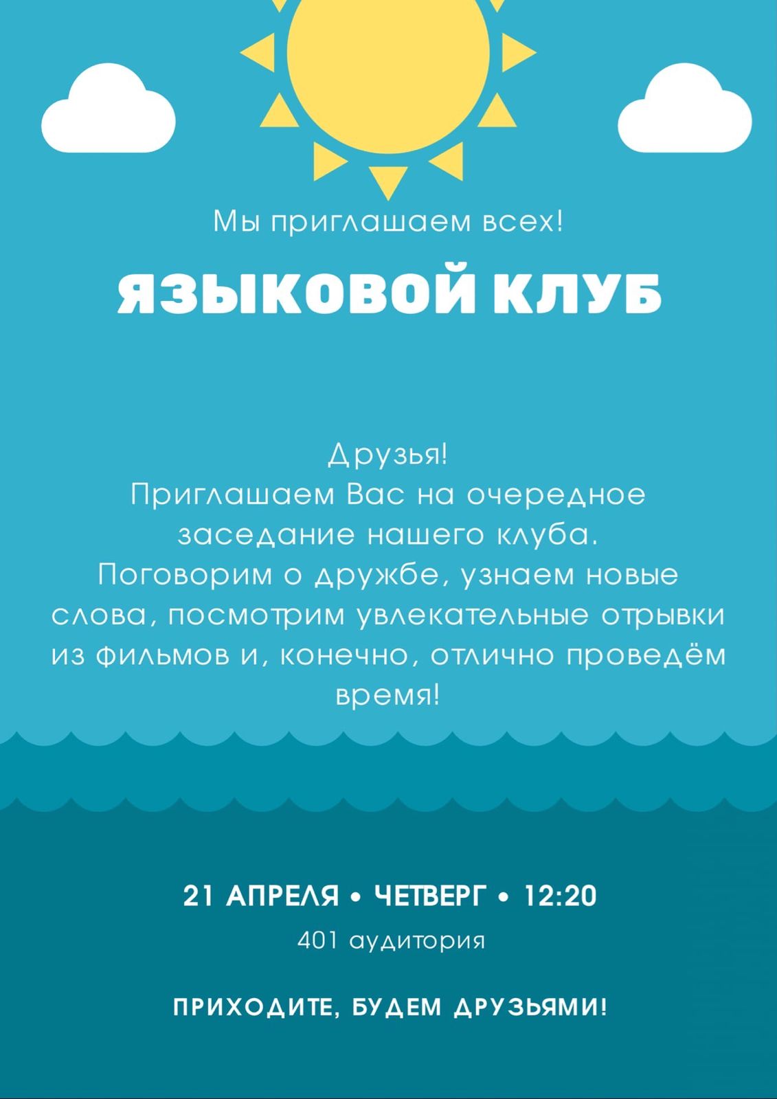 21 апреля в 12-20 часов в корпусе №3 (аудитория  №401) состоится очередное заседание языкового клуба. Приглашаем все желающих!