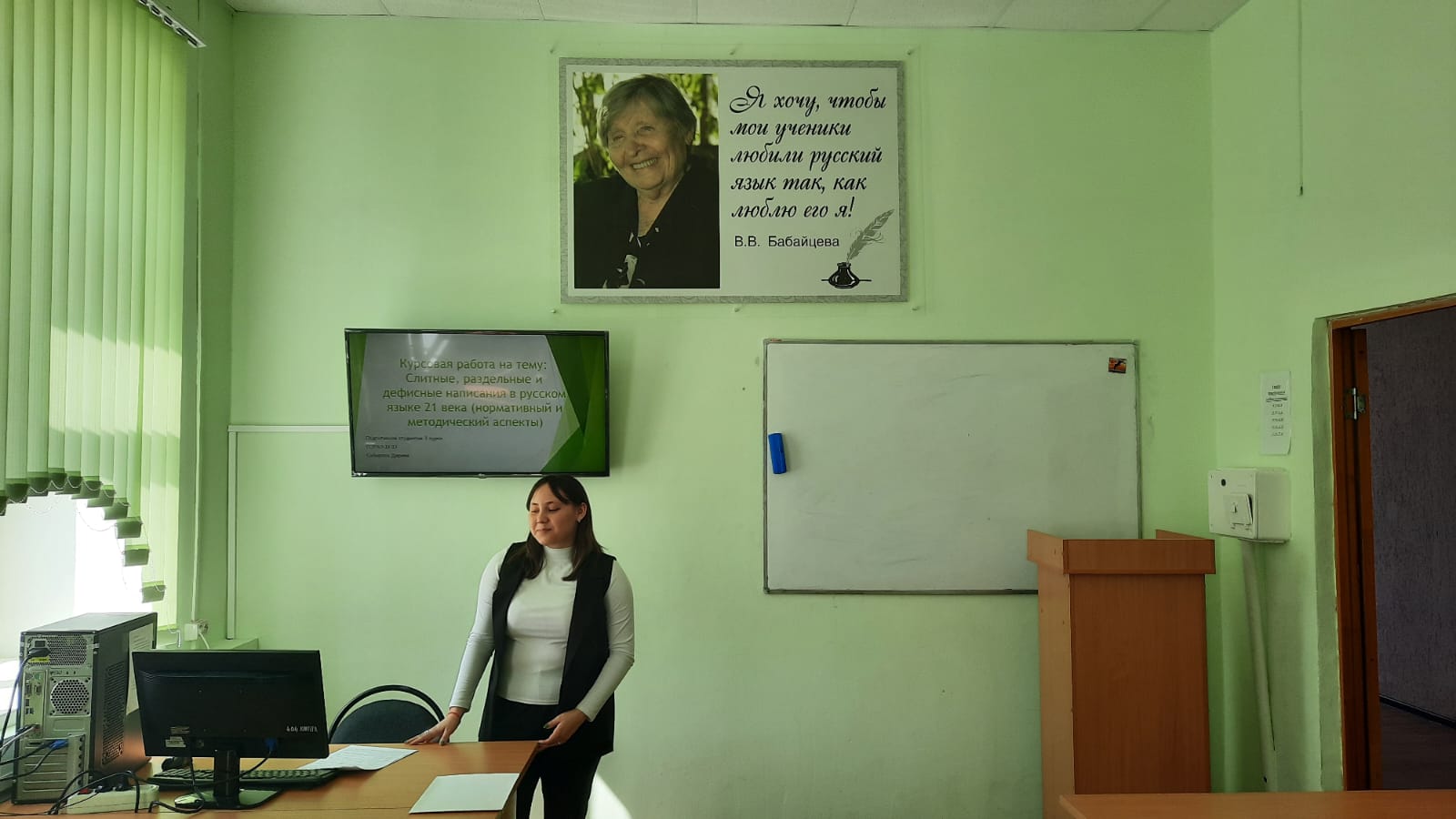 Сабирова Д. Р. рассказала о работе над КР по теме:  «Слитные, дефисные и раздельные написания в русском языке 21 века» (науч. руководитель – к.ф.н., доцент Родионова А. Е.). Студентка  затронула актуальную тему, отражающую тенденции в слитном, дефисном и раздельном написании слов в современном русском языке. Участники задавали вопросы и делились своим мнением. Например, Шайхутдинов А.А. отметил высокие аналитические и исследовательские способности докладчика, логичность и грамотность исследования. Морозова В. Ш. предложила докладчику подробнее рассмотреть какой-то отдельный аспект исследования, изучить его подробнее. Ашуров А. Б. предложил переформулировать тему и расширить ее, а также подробнее рассмотреть тенденцию слитного написания слов.
