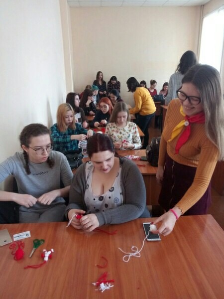 В Институте филологического образования и межкультурных коммуникаций уже по традиции приход весны встречают изготовлением мартениц - украшений из шерсти или ниток-мулине красного и белого цвета.     В этом году ИФОМК посетила исполнительный директор Болгарского культурного центра Татьяна Коробова, проведя для студентов 3 курса отделения отечественной филологии мастер-класс по изготовлению болгарских оберегов – мартениц. Татьяна Коробова также выступила с презентацией о национальном празднике Республики Болгария – 3 марта – Дне освобождения от Османского ига и об участии России в освободительной борьбе болгарского народа, рассказала о народных традициях встречи весны в Болгарии.  1 марта студенты 3 курса отделения отечественной филологии поздравили с началом весны первокурсников, подарили им мартенички и научили их изготавливать самим.