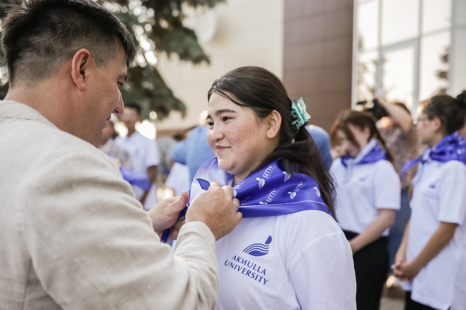 По традиции, принимая новоявленных студентов в семью Акмуллинского университета, им повязали галстуки вуза. В церемонии также приняли участие проректор по молодежной политике и международным связям Радик Юлбаев, и.о. начальника управления международных связей Резеда Мухитдинова и и.о. директора центра «Салихово» Наталья Шангина.