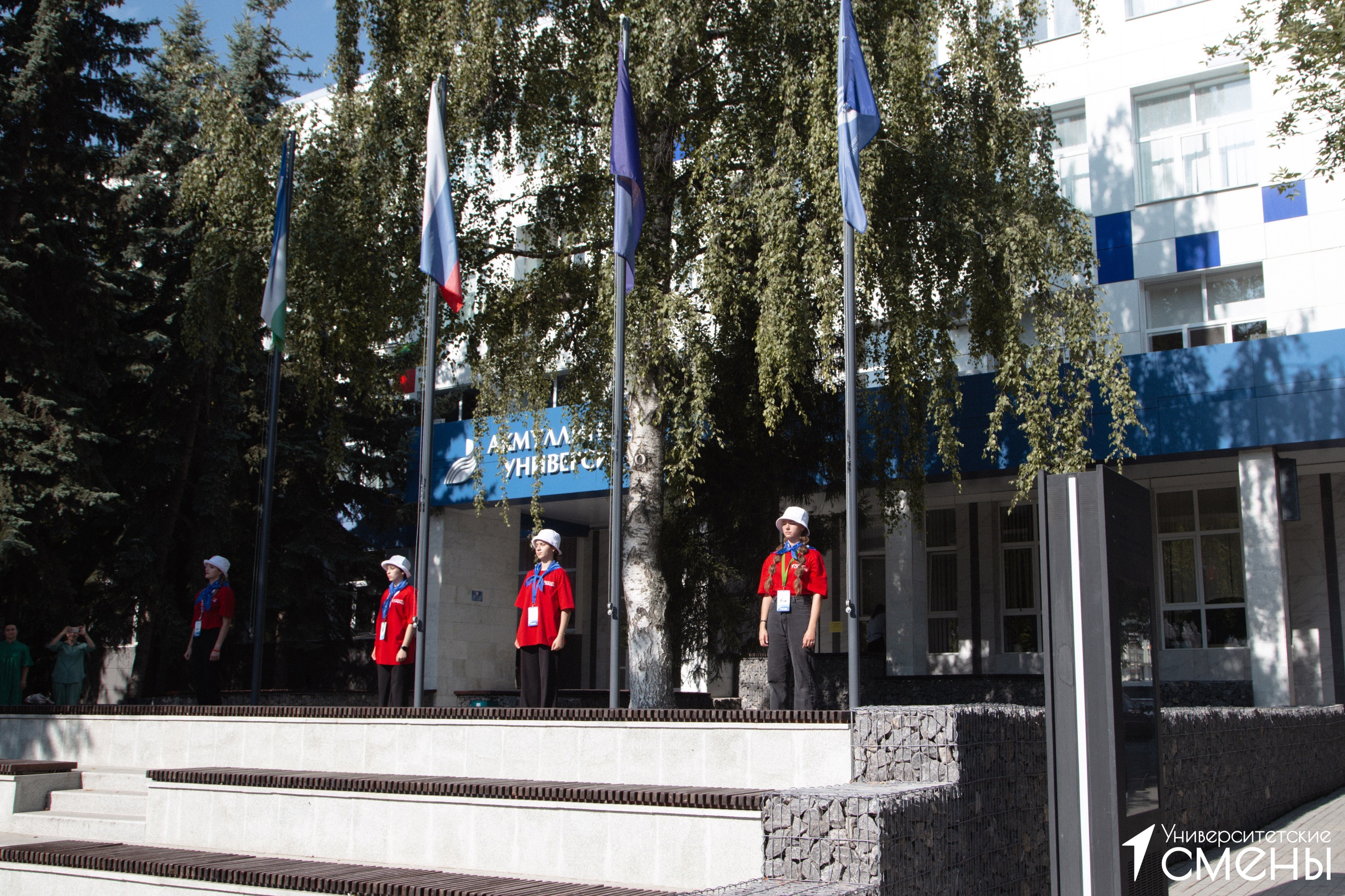 Заключительный день «Университетской смены» в БГПУ имени Акмуллы стал Днём Первых. По традиции этот день начался с торжественной церемонии поднятия флагов. Почетное право было предоставлено командирам отрядов смены Ольге Кистерной, Валерии Машаровой, Сабине Шахтариной и Яне Крутолаповой.
