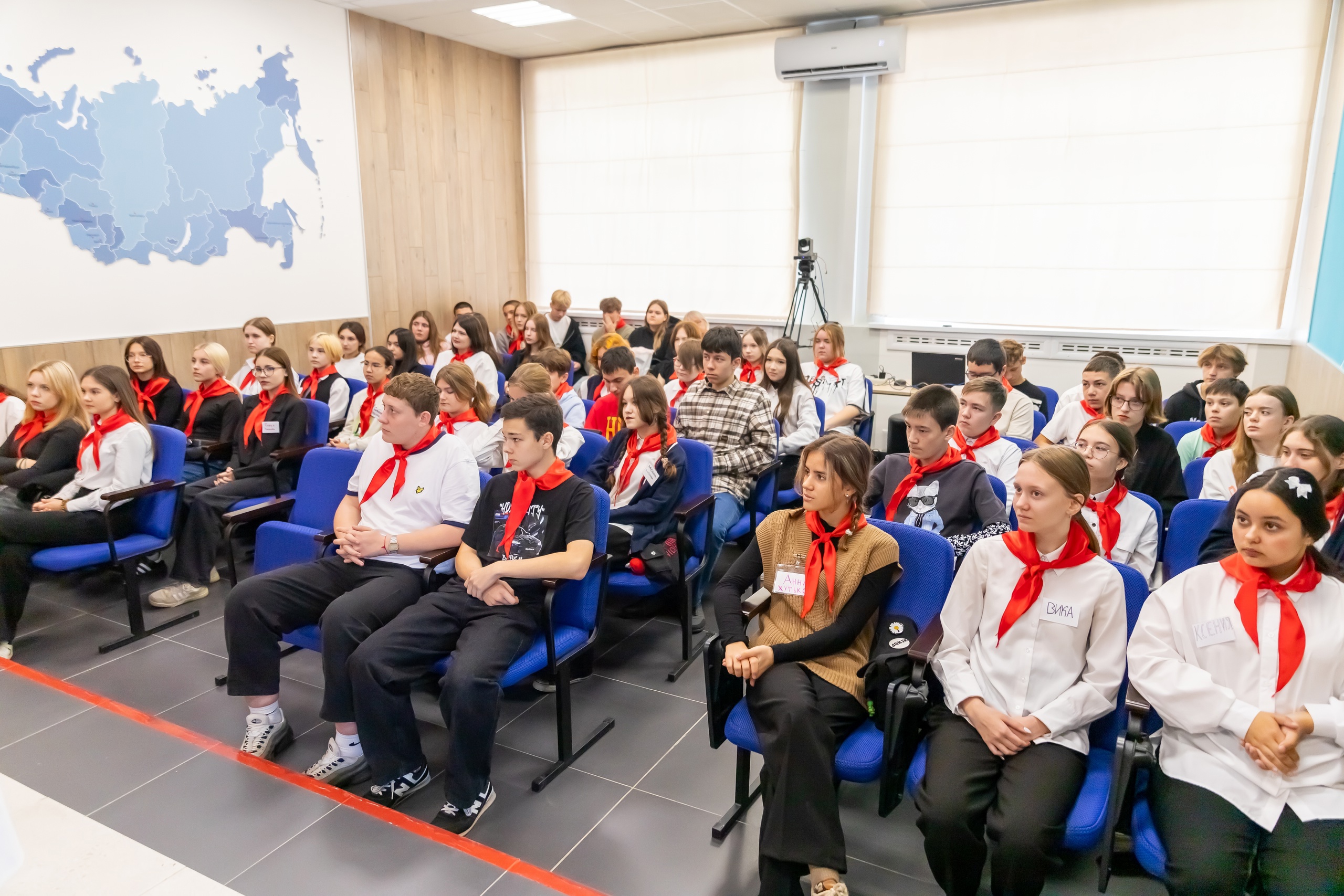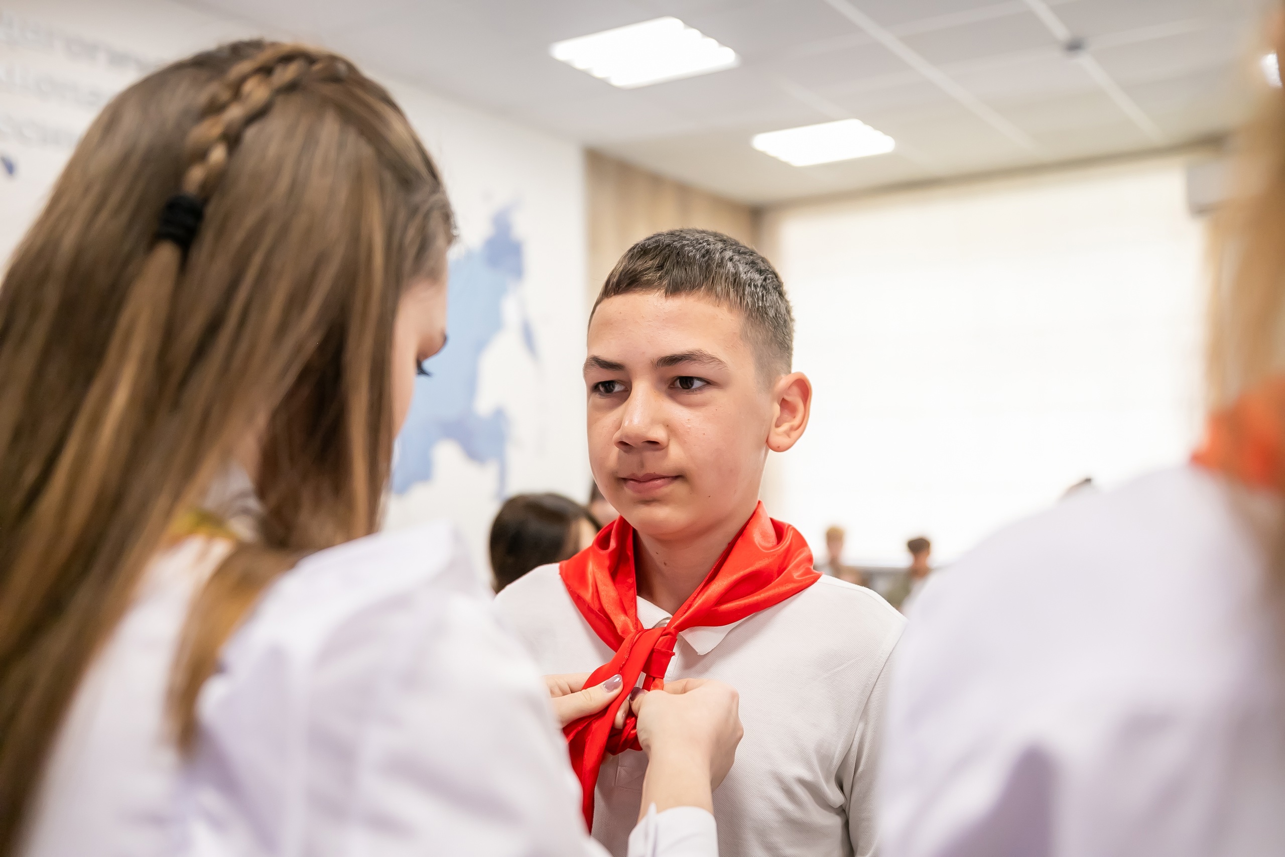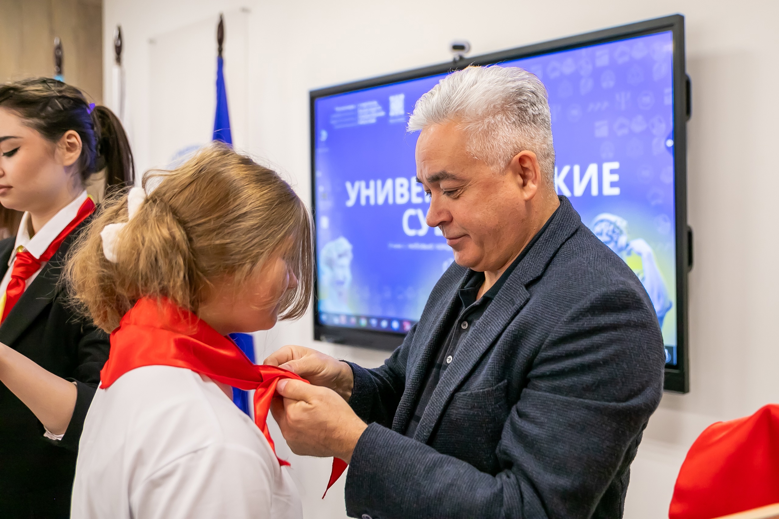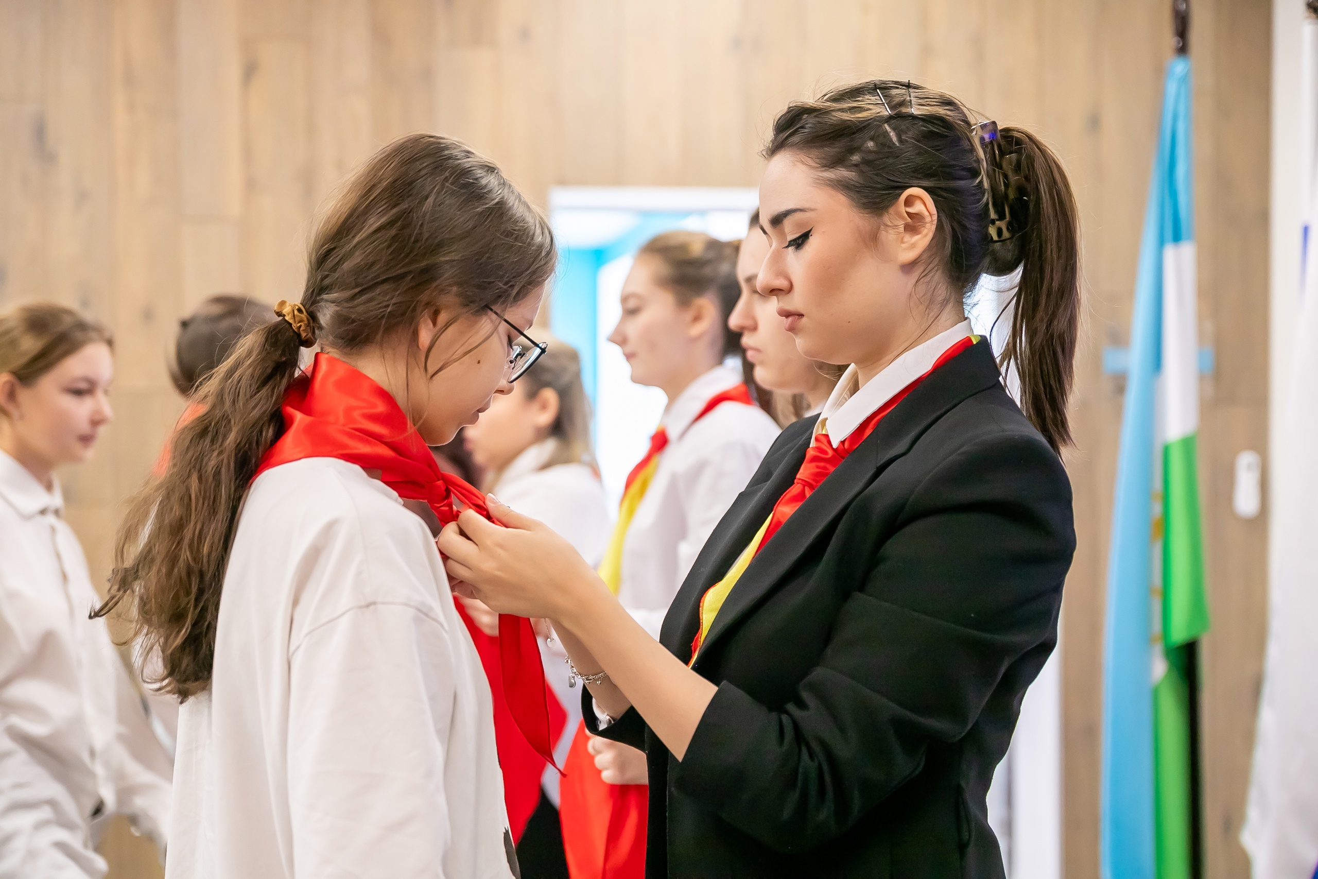 Старший преподаватель кафедры педагогики БГПУ им. М. Акмуллы Алексей Дударенко при участии студентов провел для школьников занятие «Вожатый – профессия птица», которое началось с посвящения в вожатые и повязывания галстуков.