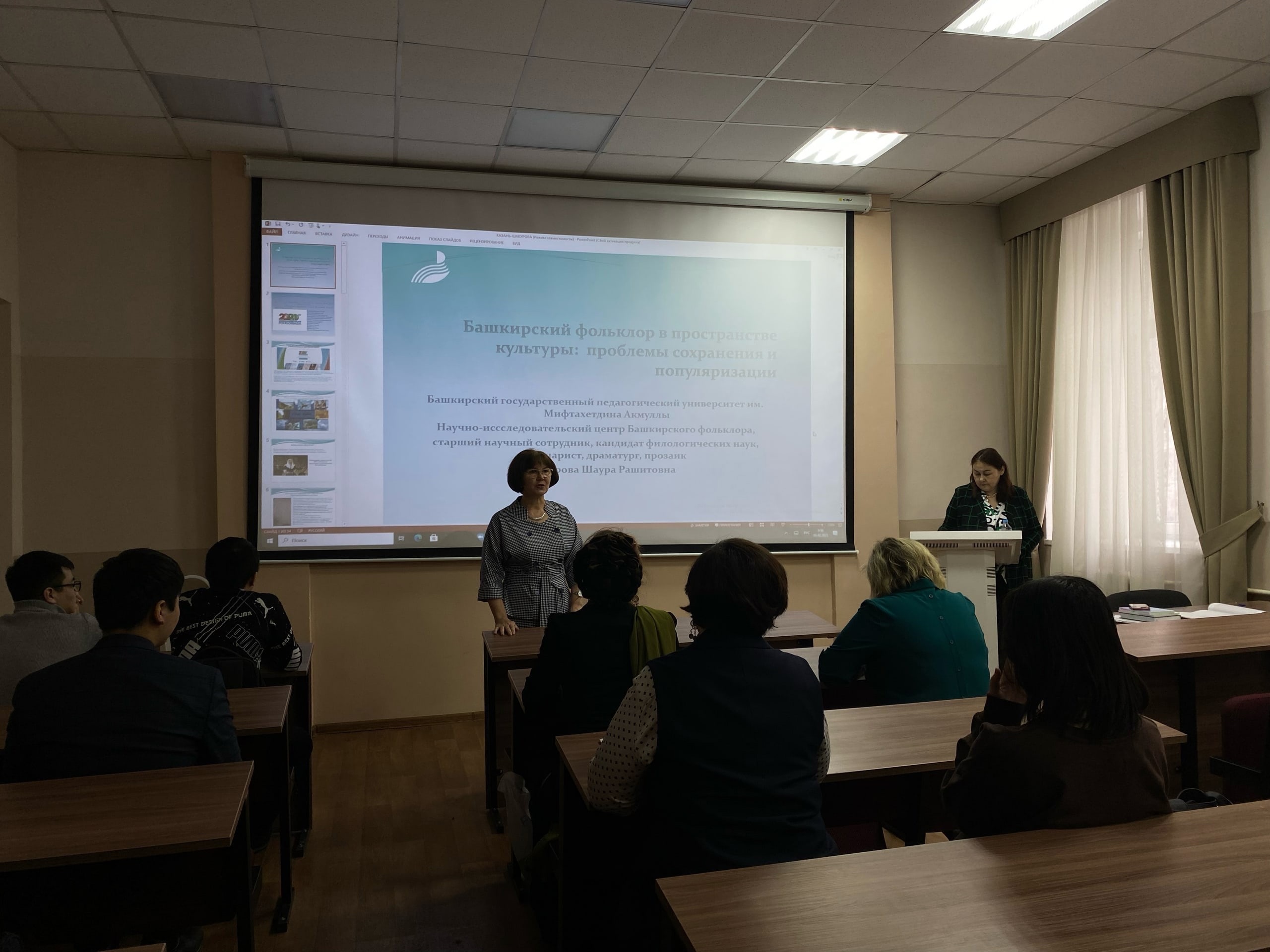 В 14.00 часов в НИ Центре Башкирского фольклора состоялся Круглый стол, посвящённый 55-летию к.ф.н., с.н.с. Шакуровой Шауры Рашитовны. В работе Круглого стола приняли участие и выступили специальные гости центра: доктор филологических наук, профессор БГПУ им. М. Акмуллы Шакуров Рашит Закирович, обозреватель Информационного агентства Башинформ Лейла Кадимовна Аралбаева, начальник отдела профессионального искусства, образования и творческих проектов Министерства культуры РБ Зиннур Фаритович Сулейманов, декан факультета башкирской филологии, доктор филологических наук, профессор Ляйля Мидхатовна Хусаинова, а также руководитель НИ Центра Башкирского фольклора, доктор филологических наук, профессор Султангареева Розалия Асфандияровна, главный научный сотрудник, доктор филологических наук Хуббитдинова Нэркэс Ахметовна, кандидат филологических наук, старший научный сотрудник Шакурова Шаура Рашитовна, младший научный сотрудник Шарафитдинова Лилия Ильшатовна.