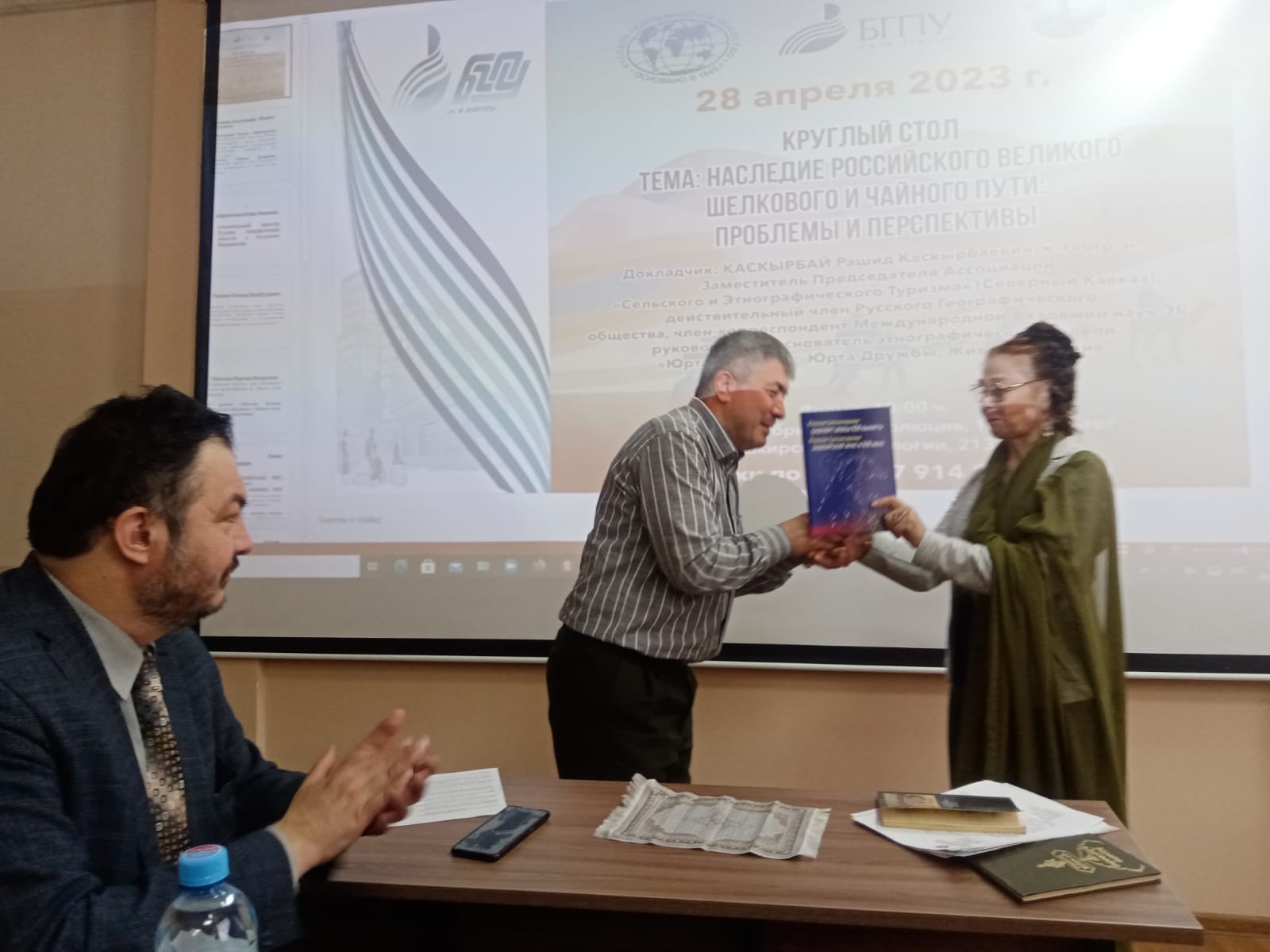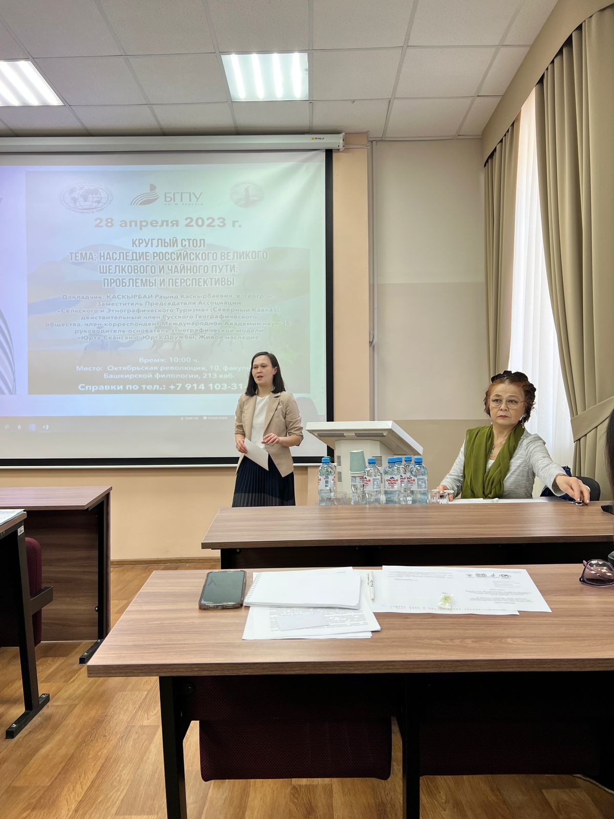 Великий Шёлковый и Чайный путь - исторические феномены, загадки и особенности как территориальные, так и географические, а также культурорлогические, которые ещё не раскрыты и эта проблема требует серьёзного изучения. 28 апреля 2023 г. на факультете башкирской филологии ФГБОУ ВО "БГПУ им. М. Акмуллы" состоялся Круглый стол «Наследие Великого Российского Шелкового и Чайного пути: проблемы и перспективы» при участии учёных, исследователей из Уфимского университета науки и технологий, Государственного бюджетного научного учреждения «Академия наук Республики Башкортостан», Ордена Знак Почета Институт истории, языка и литературы Федерального государственного бюджетного научного учреждения УФИЦ РАН, факультета башкирской филологии, НИ Центра Башкирского фольклора БГПУ им. М. Акмуллы, Всероссийской общественной организации «Русское географическое общество» Региональное отделение в Республике Башкортостана. Проект стол «Наследие Великого Российского Шелкового и Чайного пути: проблемы и перспективы»  Кандидат географических наук, Член-корреспондент Международной академии наук экологии, безопасности человека и природы, член ООО «Русское географическое общество» Каскырбаев Рашид Каскырбаевич (Северный Кавказ, Кабардино-Балкария). Этот проект поддержан многими ведущими научными учреждениями России. В ходе горячих дискуссий учёные обсудили важнейшие вопросы: этнографические аспекты, лингвистические, археологические, культурологические, историко-типологические, национальные и многие другие особенности феномена "Шёлкового и Чайного пути". На Круглом столе также выступили координатор проекта, член Российского союза фольклористов Обоюкова Варвара Валерьевна (г. Якутск, Саха (Якутия) член Союза фольклористов России, координатор проекта (Якутия), представители Министерства образования РБ, Академии наук РБ, Всемирного курултая (конгресса) башкир.