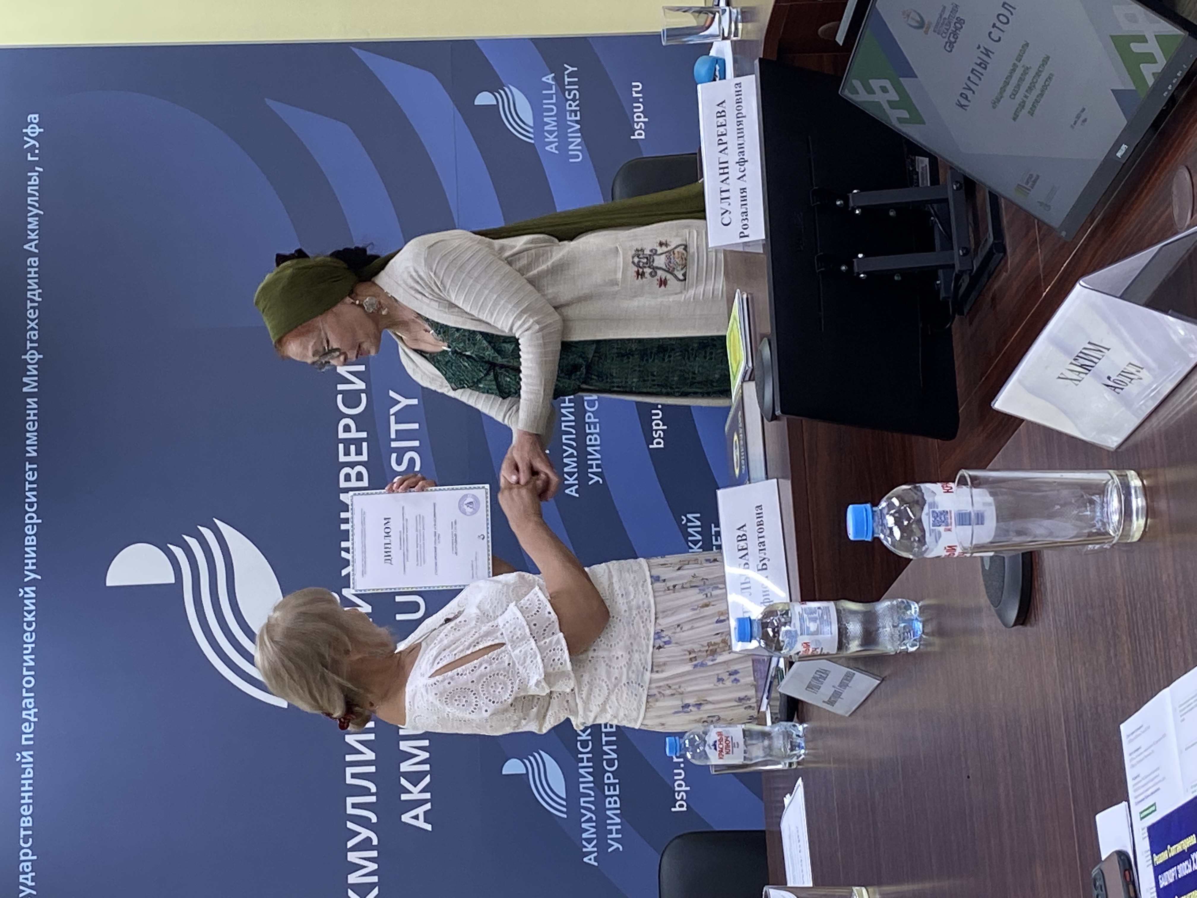 В заключении Круглого стола, заместитель генерального директора РЦНТ РБ Нафиса Тулыбаева вручила дипломы о звании Народного сэсэна Розалии Султангареевой и декану факультета башкирской филологии Ляйле Хусаиновой звание Народной - Школе сэсэнов  БГПУ им. М. Акмуллы (рук. Р. Султангареева).