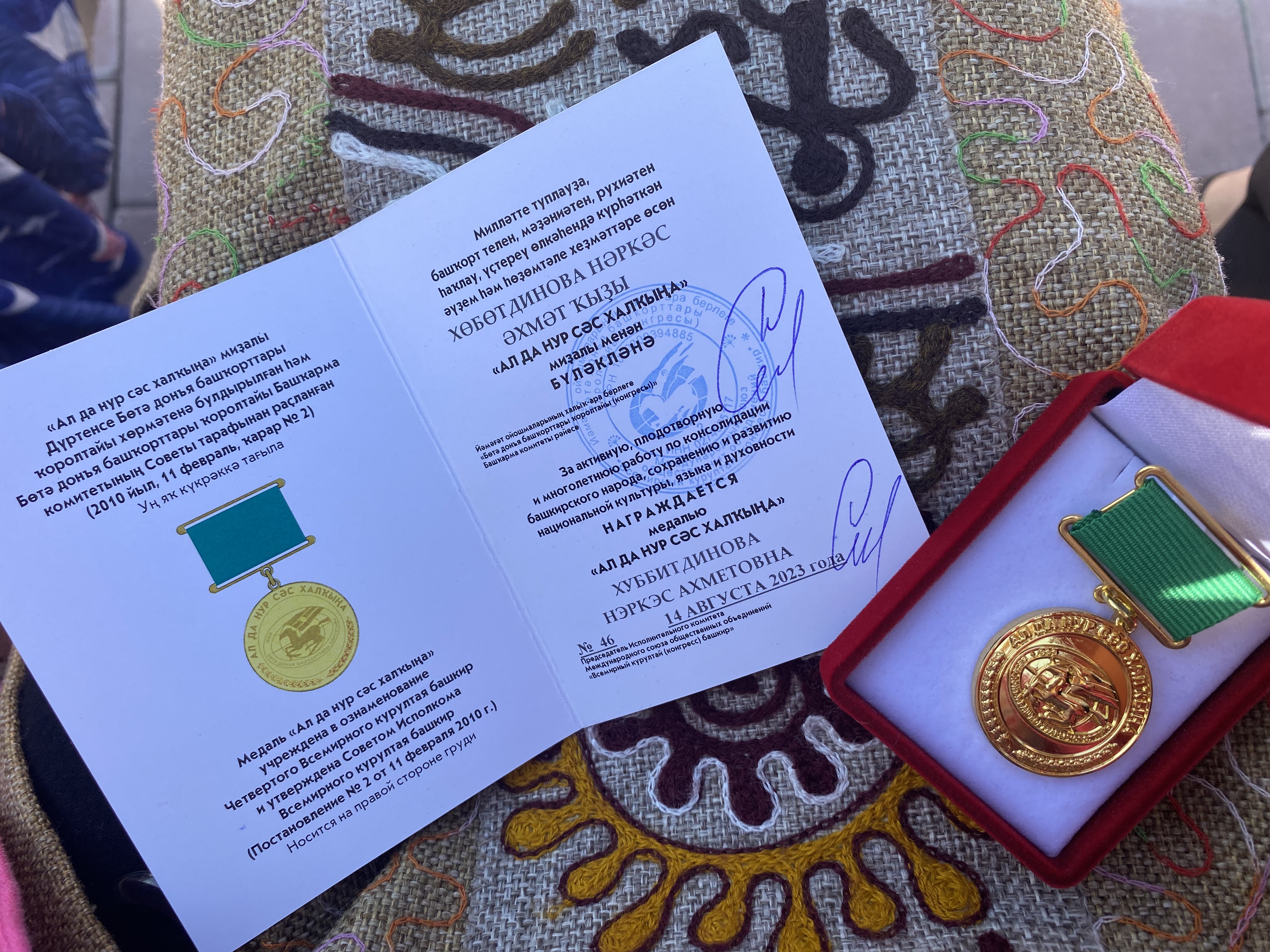 18 августа 2023 г. сотрудники НИ Центра Башкирского фольклора ФГБОУ ВО "БГПУ им. М. Акмуллы" Султангареева Р.А. и Хуббитдинова Н.А. приняли участие на закрытии Межрегионального детского конкурса сказителей эпоса "Урал-батыр" в Бурзянском районе. Хуббитдинова Н.А. - председатель жюри конкурса была награждена медалью "Ал да нур сәс халҡыңа" от Всемирного курултая башкир, также сотрудники Центра были отмечены благодарственными письмами Министерства образования и науки Республики Башкортостан.