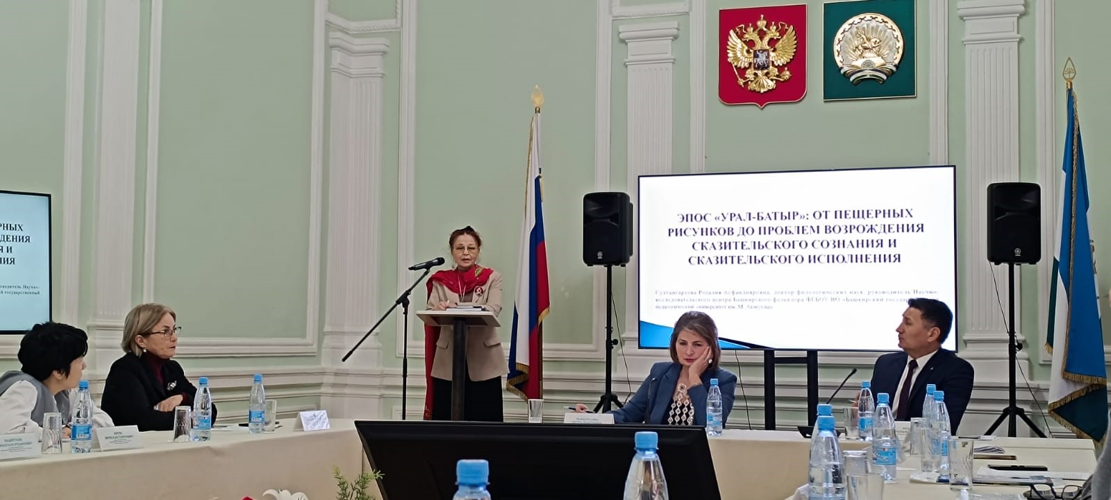 В рамках круглого стола с докладом на тему «Эпос «Урал-батыр»: от пещерного рисунка до сказительских традиций и искусства XXI века» выступила руководитель Научно-исследовательского центра Башкирского фольклора Султангареева Р.А. Её выступление было посвящено истории возникновения и развития эпоса, начиная с древнейших времен и заканчивая современными интерпретациями в искусстве.