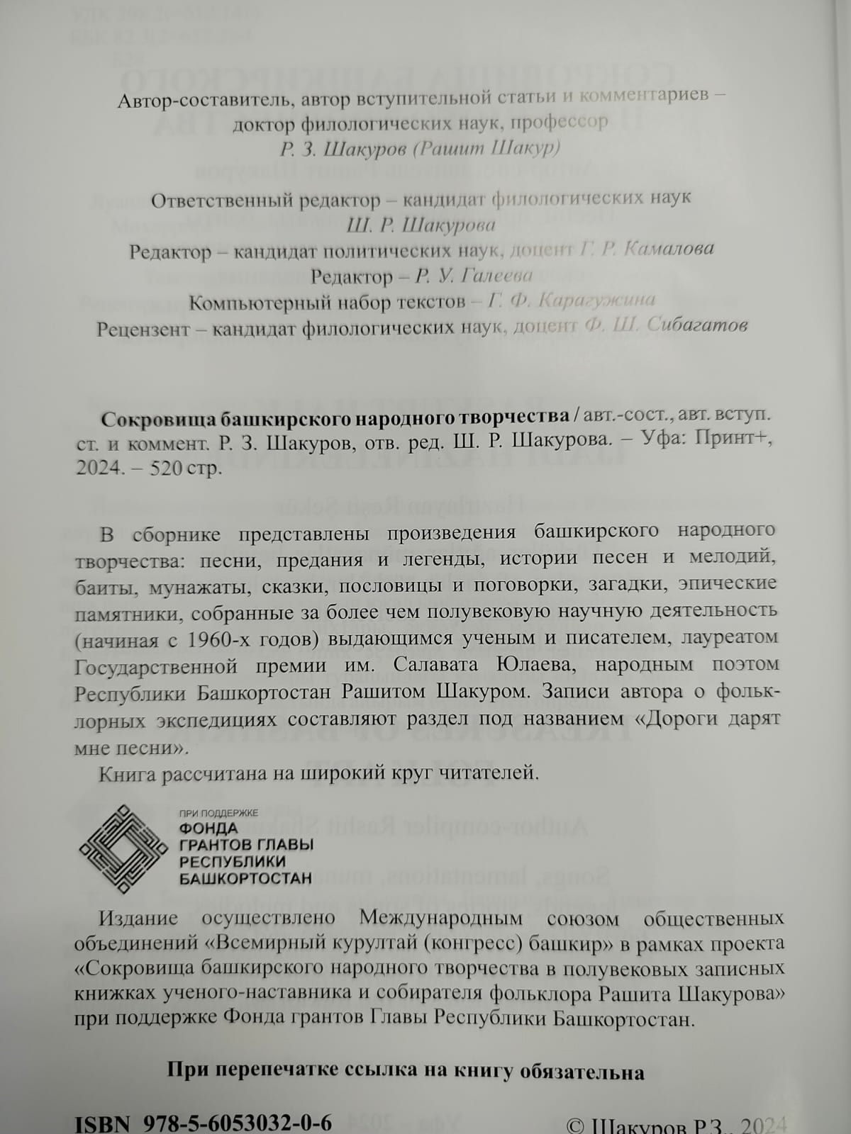 Доклад посвящен истории возникновения фольклорной коллекции профессора Р.З. Шакурова (1937-2024), которая собиралась с 1959 года. Рашит Закирович Шакуров – выдающийся башкирский учёный-тюрколог, топонимист, поэт, публицист, общественный деятель, специалист в области фольклористики. На основе собранной им уникальной коллекции фольклорных произведений опубликован сборник «Сокровища башкирского народного творчества». В издании представлены следующие жанры: песни, плачи, мунажаты, баиты, предания, легенды, истории песен, странные истории, сказки, эпические произведения, пословицы, поговорки, приметы, загадки, кулямасы.  Отдельный раздел посвящен запискам фольклориста.