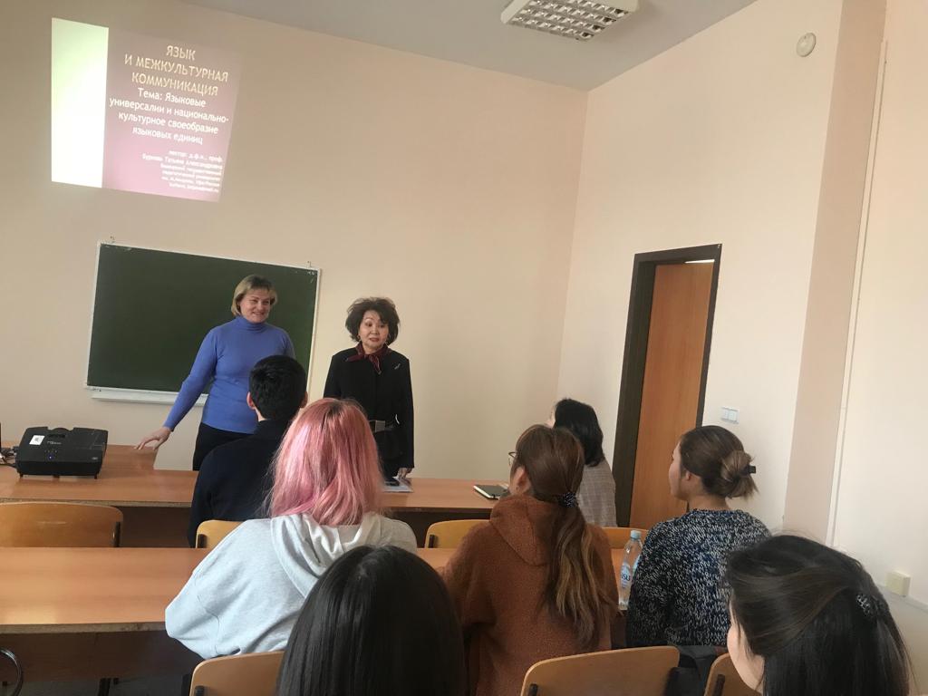 28 ноября 2019 года заведующий кафедрой романо-германского языкознания и зарубежной литературы БГПУ им. М. Акмуллы (Россия, г. Уфа), д.ф.н., профессор Буркова Т.А. в качестве гостевого лектора прочитала для студентов филологического отделения Евразийского национального университета им. Л.Н.Гумилева лекцию на тему «Языковые универсалии и национально-культурное своеобразие языковых единиц». На обсуждение были вынесены такие вопросы, как языковые универсалии, национально-культурная семантика языковых единиц, фразеологический фонд, социокультурный аспект цветообозначений. Интерактивный формат лекции дал импульс к переосмыслению отдельных лингвистических категорий через призму родной культуры.