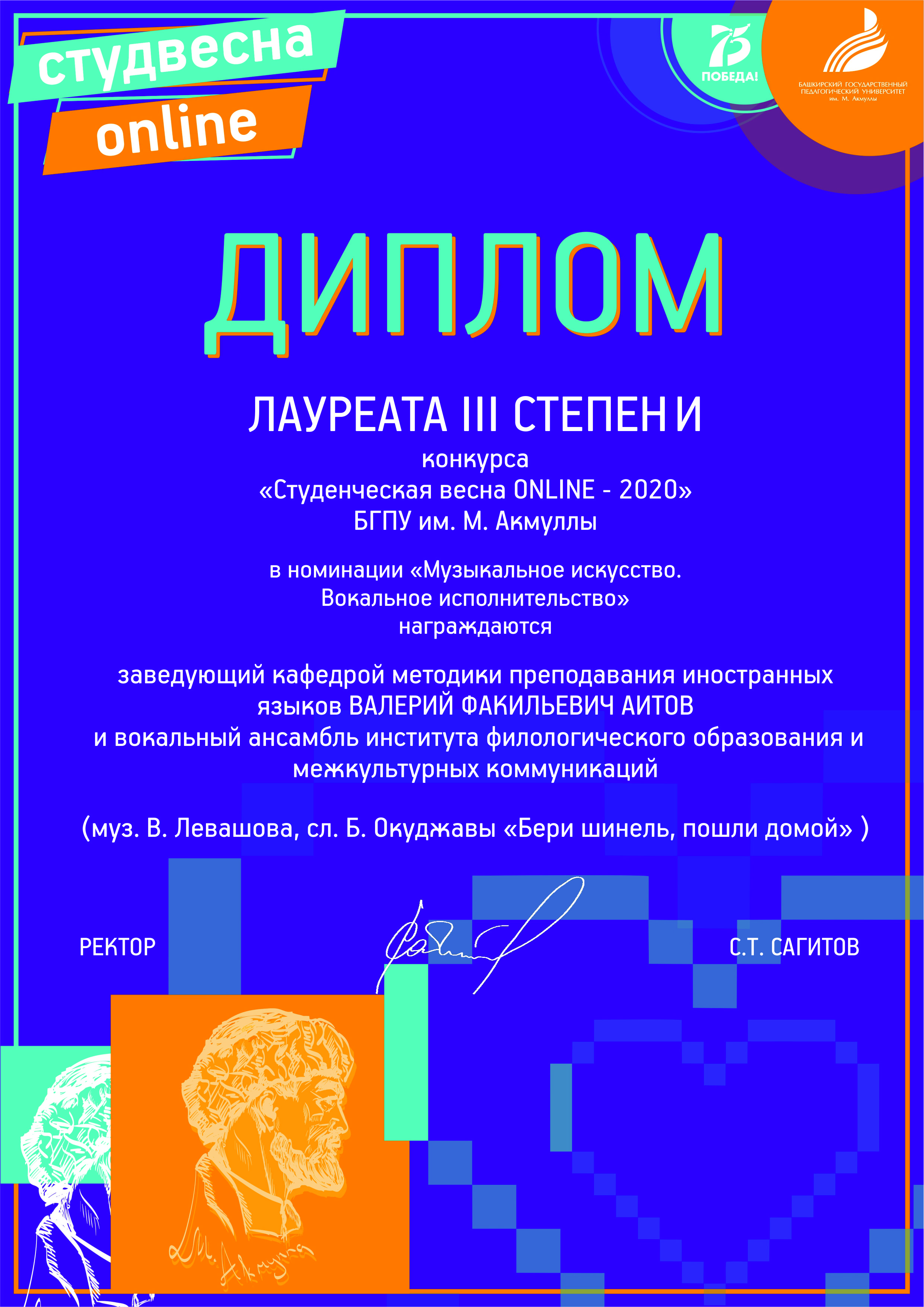 До 5 мая 2020 года шел прием заявок на конкурс «Студвесна online - 2020» БГПУ им. М. Акмуллы, посвященный 75-летию Победы в Великой Отечественной войне.